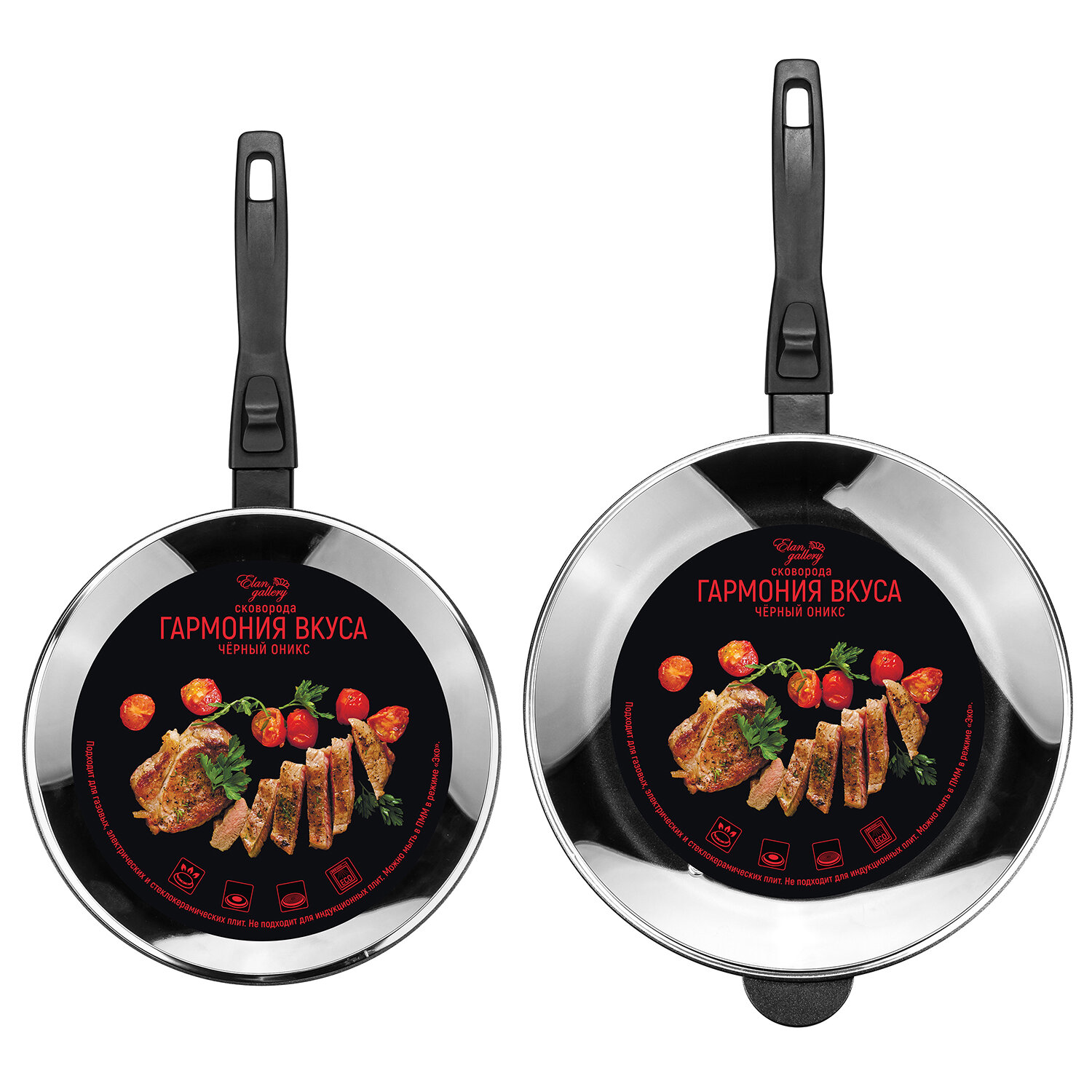 Набор 4 пр. Elan Gallery гармония вкуса Черный Оникс Сковорода глубокая 24 см, 28 см + крышки + съёмные ручки