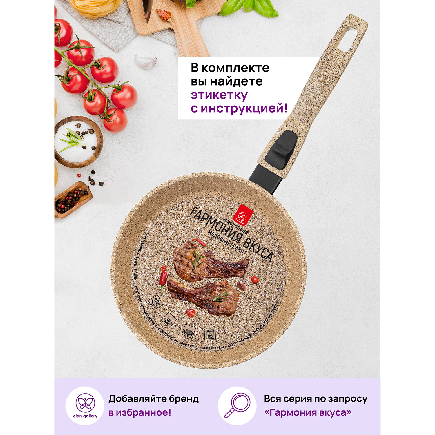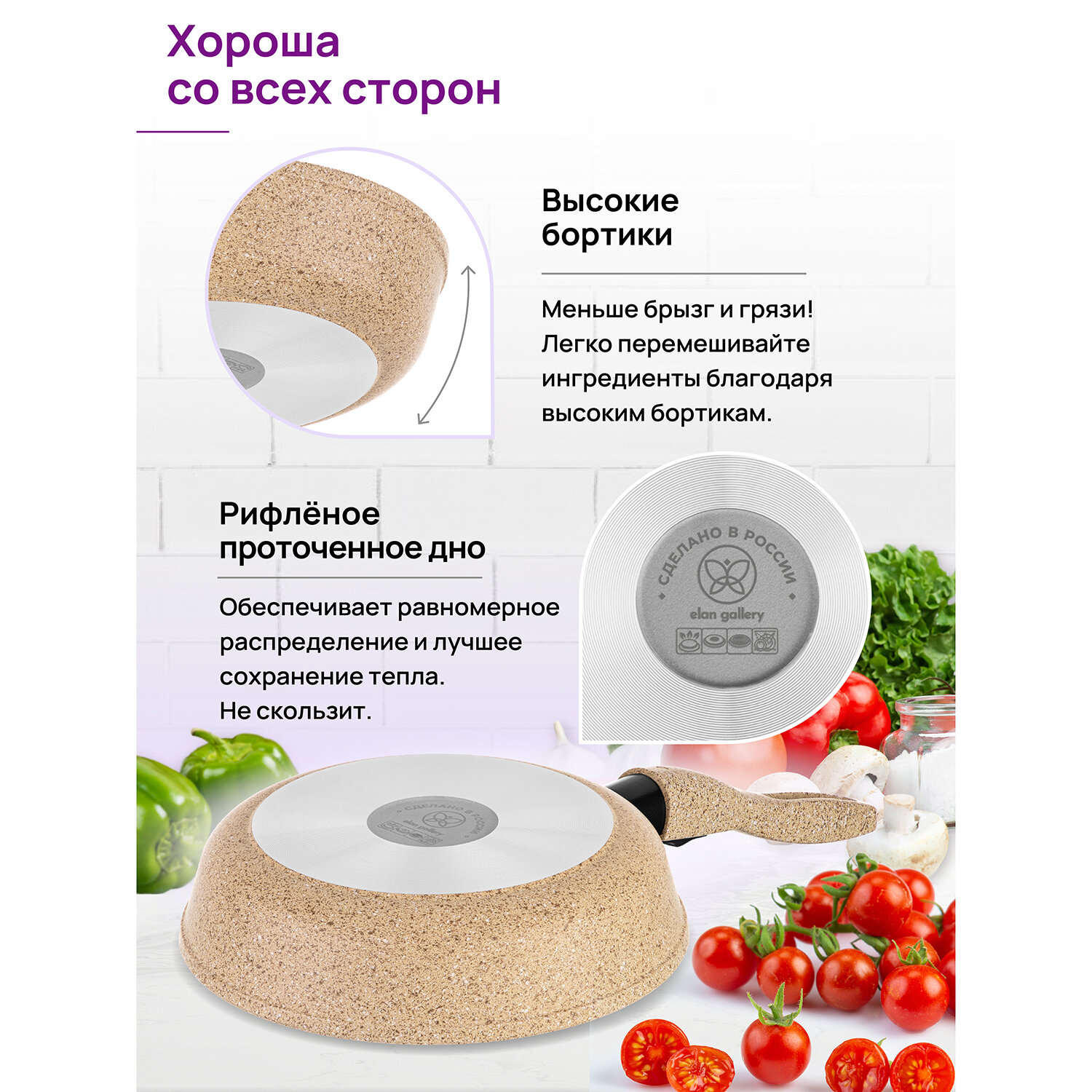 Сковорода глубокая 26 см Elan Gallery гармония вкуса Медовый гранит с крышкой D26, со съёмной ручкой интересное: