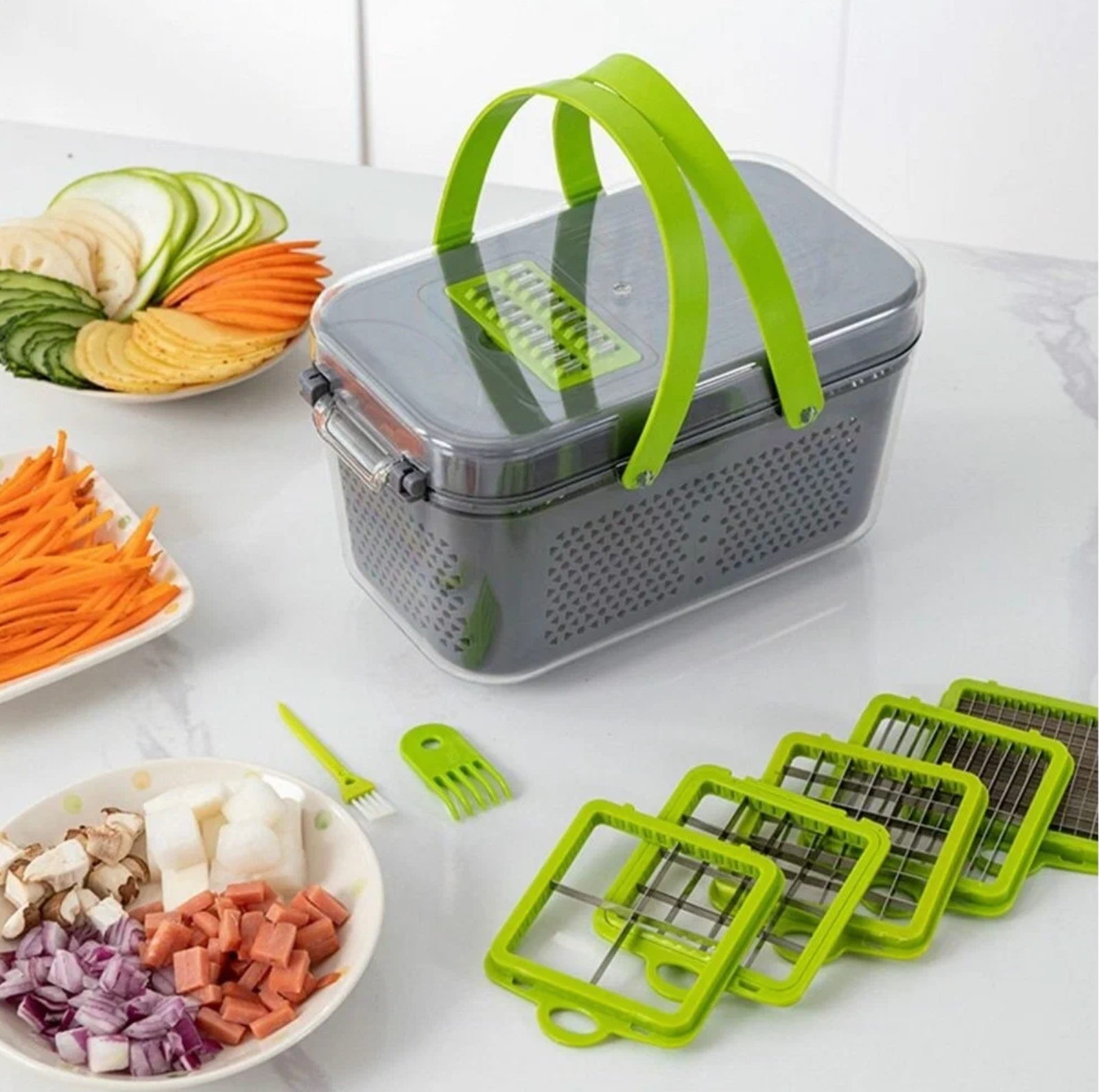| Комплектация | Контейнер Корзина для мытья Пластиковый держатель 13 насадок Отделитель белка Нож для чистки овощей Безопасный держатель для продуктов при нарезке Щетка для чистки пресса Кисточка |