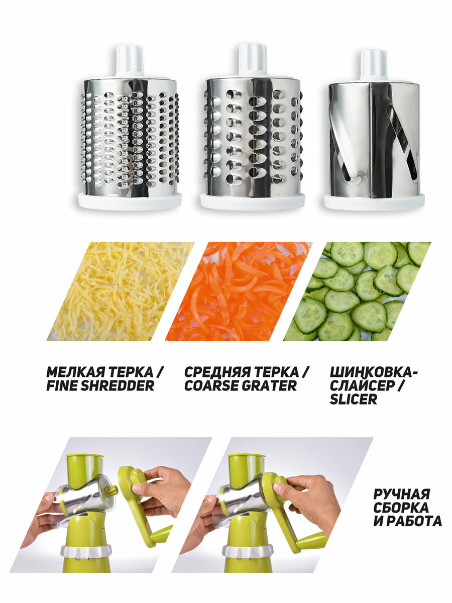 | Комплектация | овощерезка, 3 насадки (мелкая терка, средняя терка, слайсер), пластиковый толкатель в комплекте |