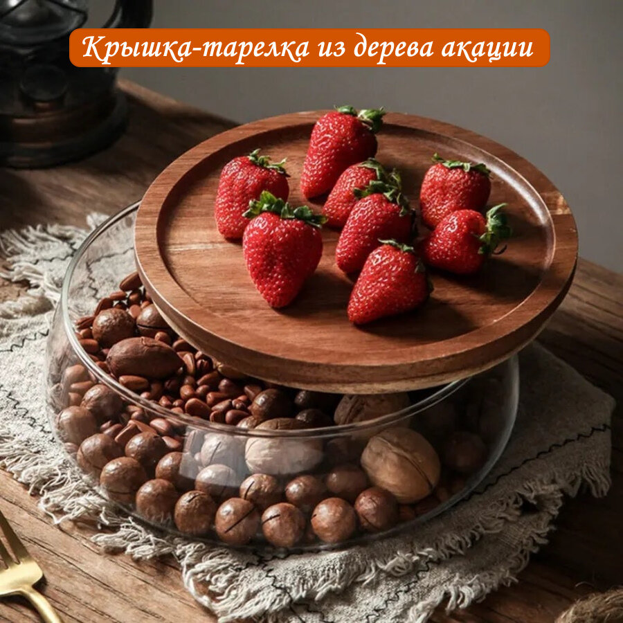 Конфетница стеклянная с деревянной крышкой из акации2400ml, фруктовница, тарелка для фруктов, менажница, тарелка с крышкой, большая ваза для конфет, банка для печенья, ваза для орехов