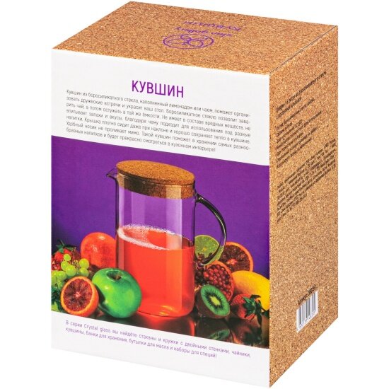 | Дополнительная информация | Графин "Crystal glass" 17,5*11,5*21 см, 1,6 л, с пробковой крышкой, высота без крышки - 19 см, диаметр горлышка внутри 11 см, боросиликатное стекло |