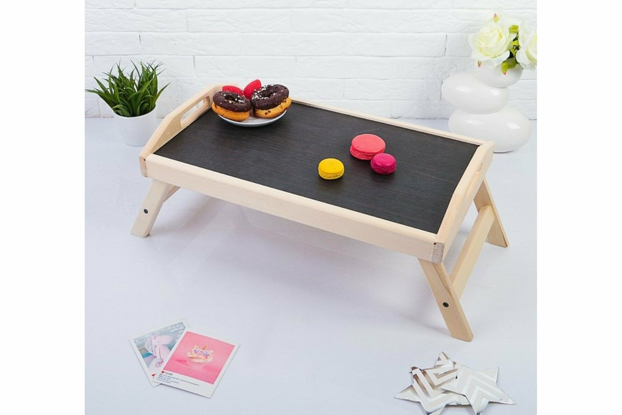 | Дополнительная информация | Стильный и компактный столик с небольшими бортиками по периметру позволит порадовать любимых завтраком в постель. Благодаря складным ножкам изделие легко переносить и удобно хранить. Поднос подходит не только для завтрака в постель — если поставить на столик ноутбук, можно смотреть кино или работать. |