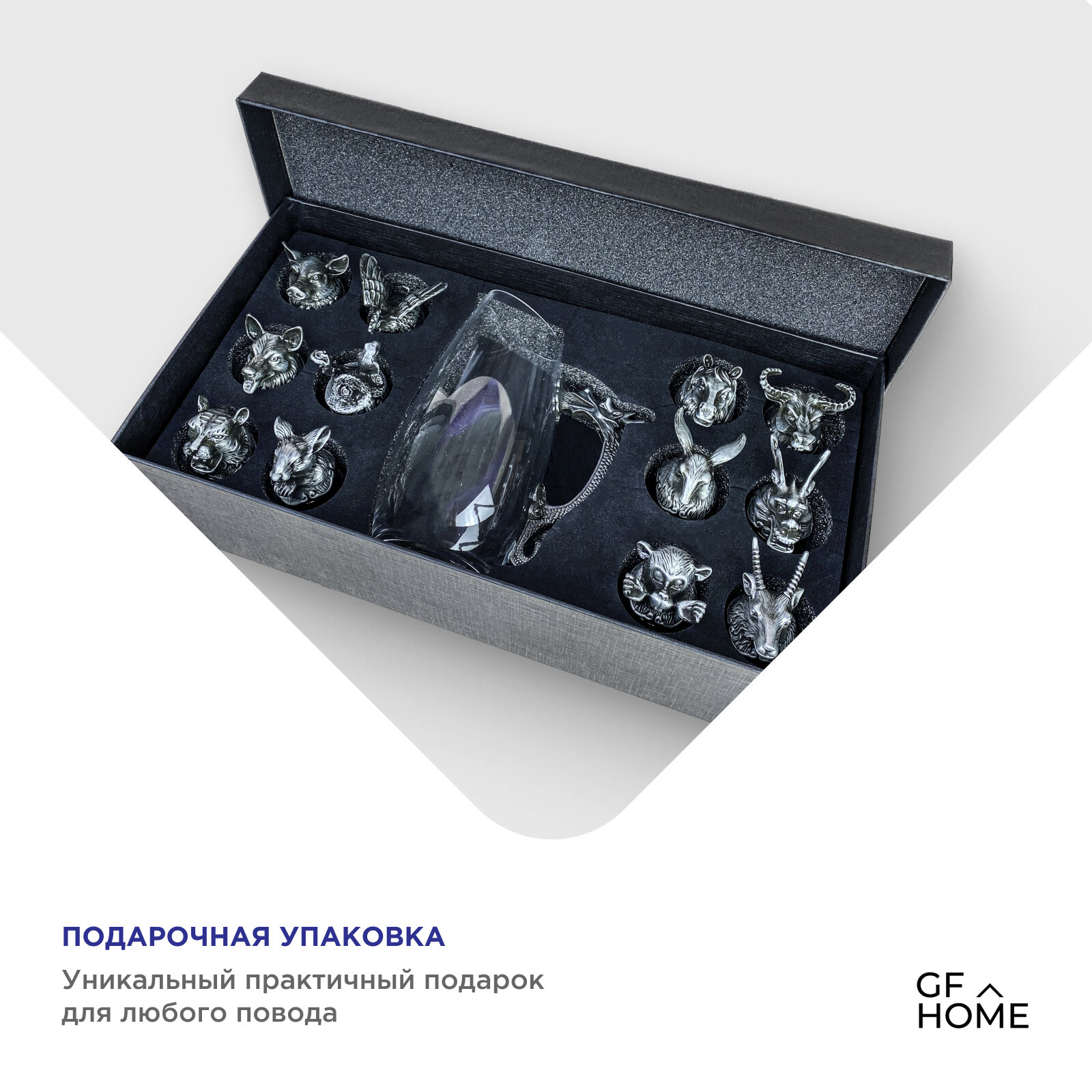 | Комплектация | В набор входит подарочная черная коробка(хорошо упаковано еще в одну коробку) 12 рюмок с 12 животными знака зодиака |