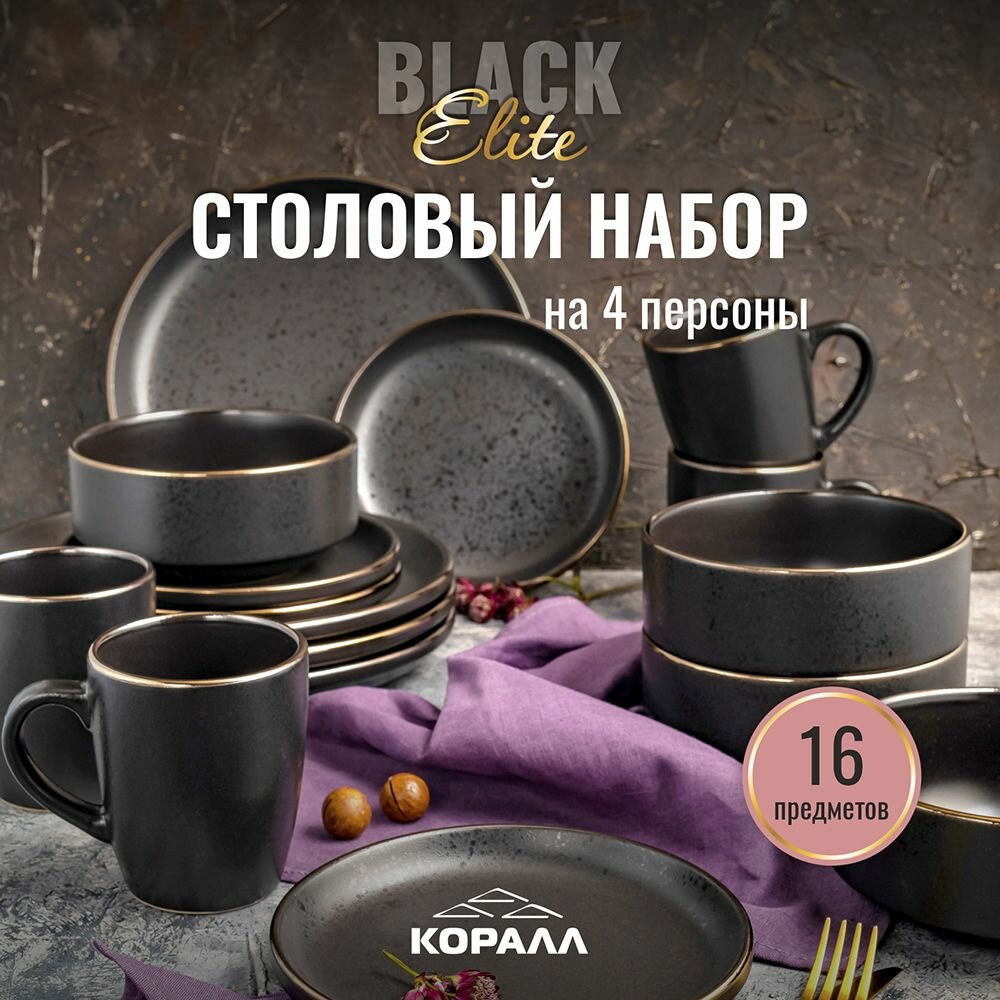 Набор посуды столовой 16 предметов на 4 персоны Elite Black керамика в подарочной упаковке столовый сервиз обеденный