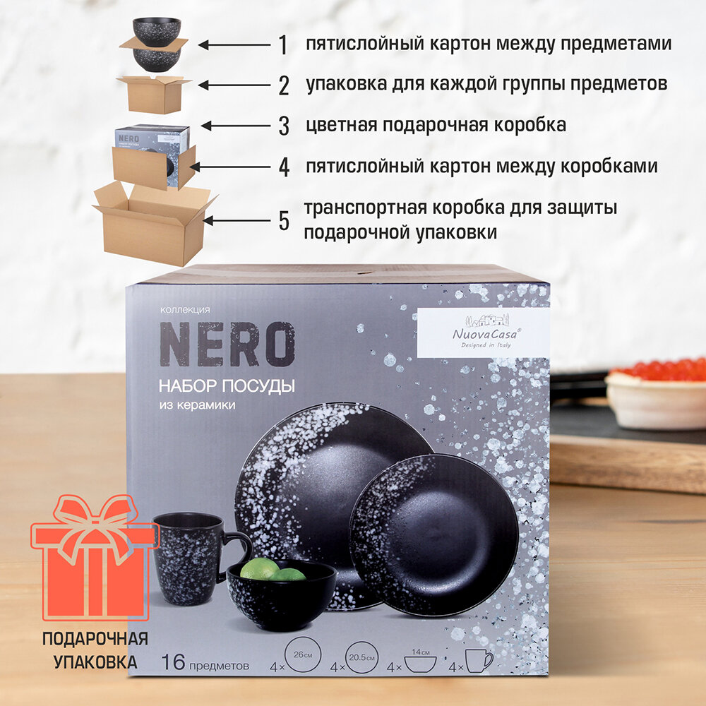 Набор посуды столовой Nero 16 предметов на 4 персоны керамика в подарочной упаковкe столовый сервиз обеденный с глубокой тарелкой