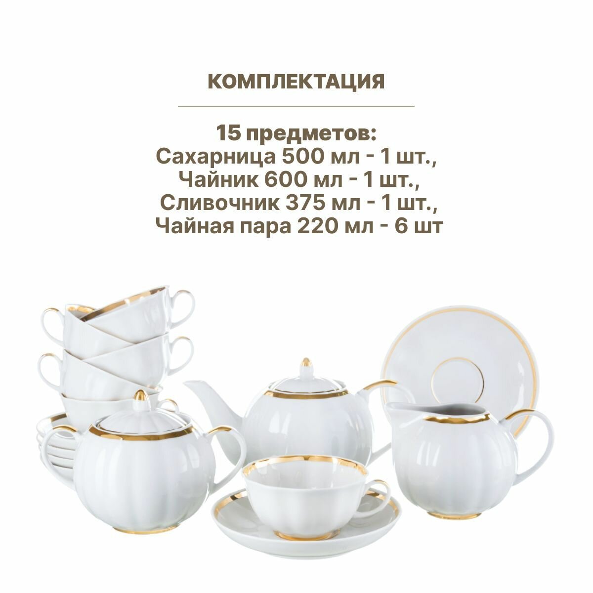 | Комплектация | чайник (750 мл) - 1 шт, сливочник (500 мл) - 1 шт, сахарница (600 мл) - 1 шт, чайная пара (220 мл) - 6 шт, блюдца - 6 шт. |