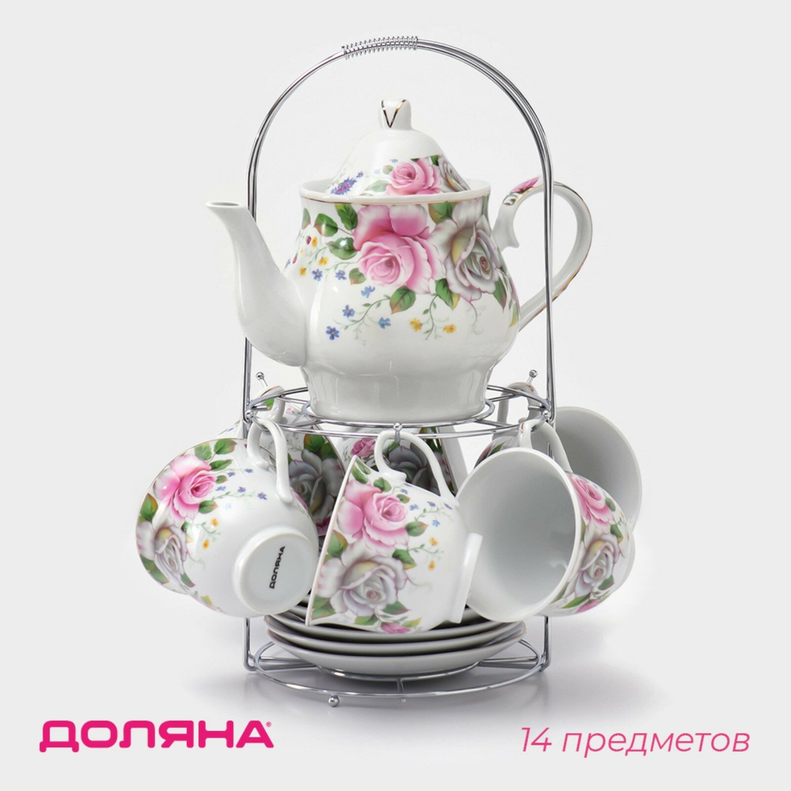 Сервиз керамический чайный на металлической подставке Доляна «Томная роза», 13 предметов: 6 чашек 230 мл, 6 блюдец d=14,2 см, чайник 1 л, цвет белый интересное: