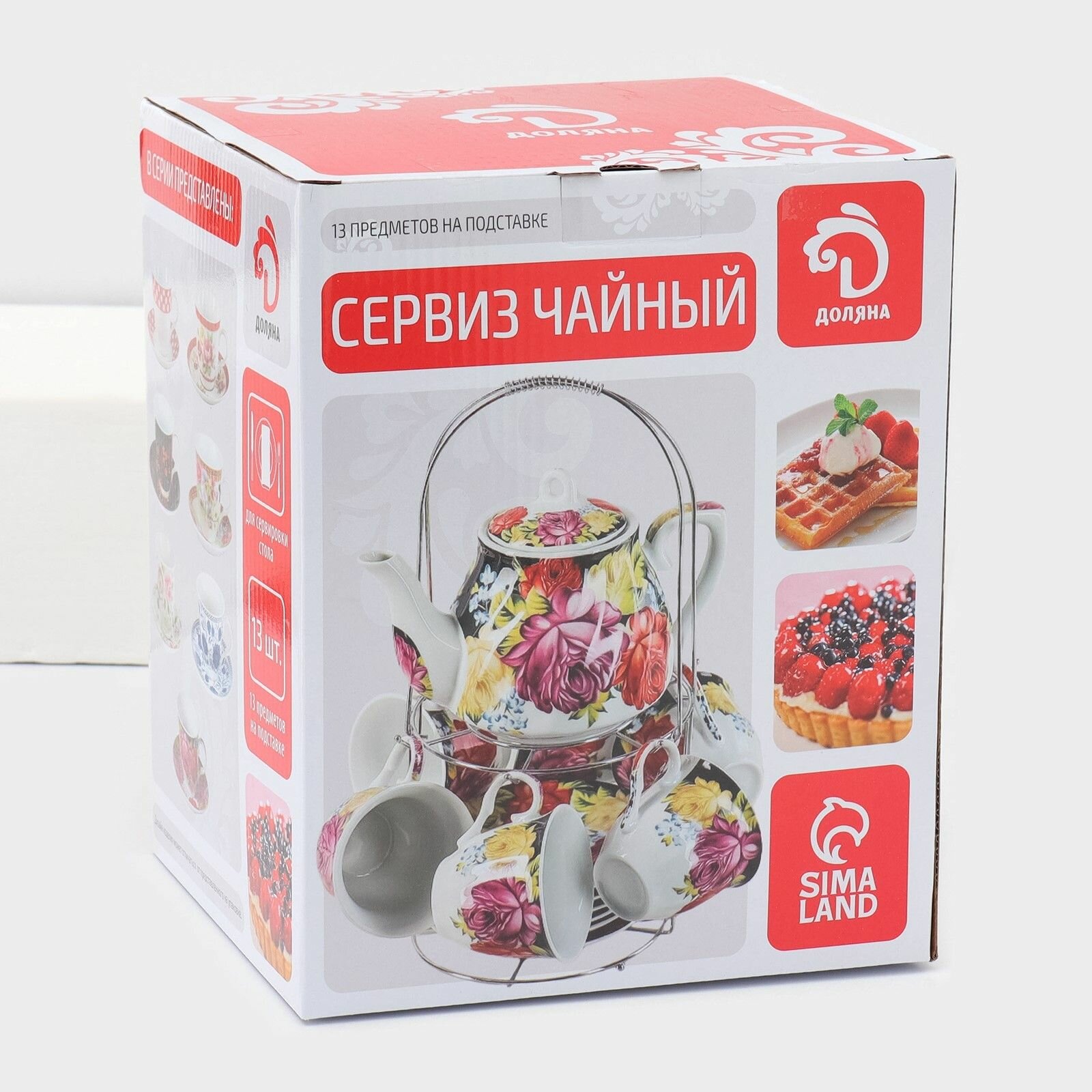 Купить Набор чайный керамический на металлической подставке Доляна «Садовый дворик», 13 предметов: 6 чашек 200 мл, 6 блюдец d=14,1 см, чайник 1 л ?