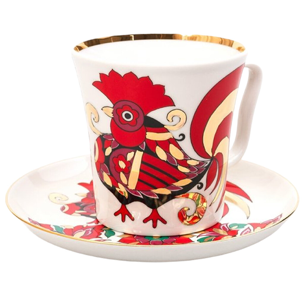 Купить Чайная пара 360 мл. Форма "Ленинградский", рисунок "Красный петух". Фарфор. Бокал с блюдцем. Императорский фарфоровый завод ИФЗ.