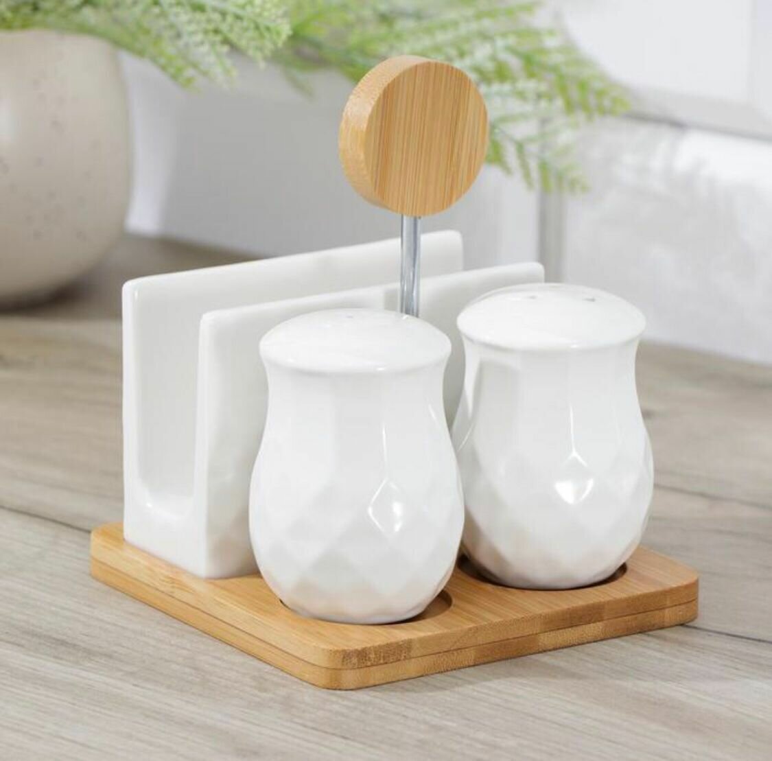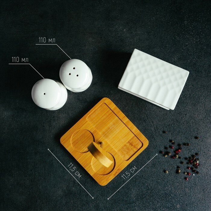 Набор фарфоровый для специй на бамбуковой подставке BellaTenero, 4 предмета: солонка 110 мл, перечница 110 мл, салфетница, подставка-держатель, цвет белый интересное: