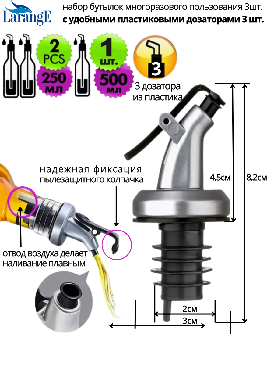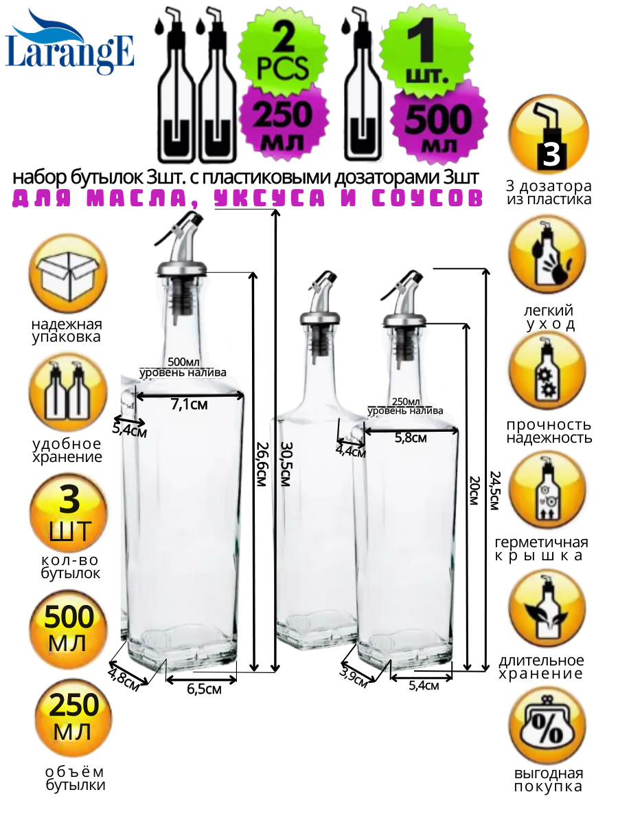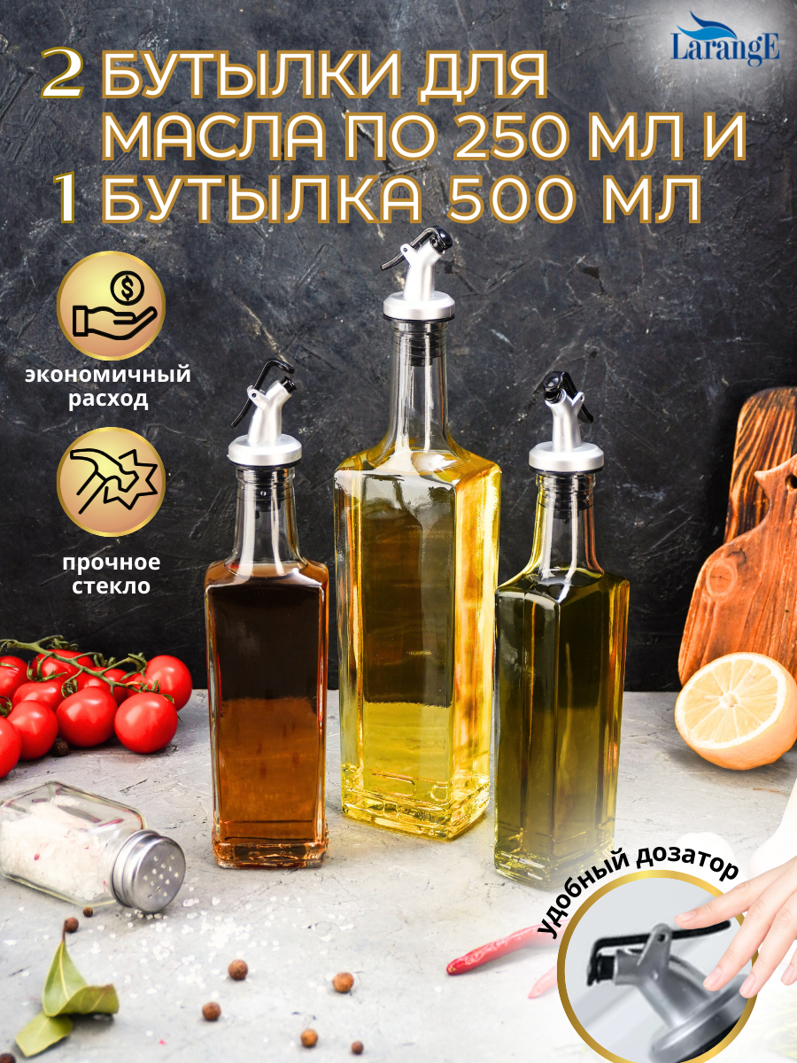 Набор бутылок для масла и уксуса с дозатором LarangE (500 мл - 2 шт, 250 мл - 1 шт)