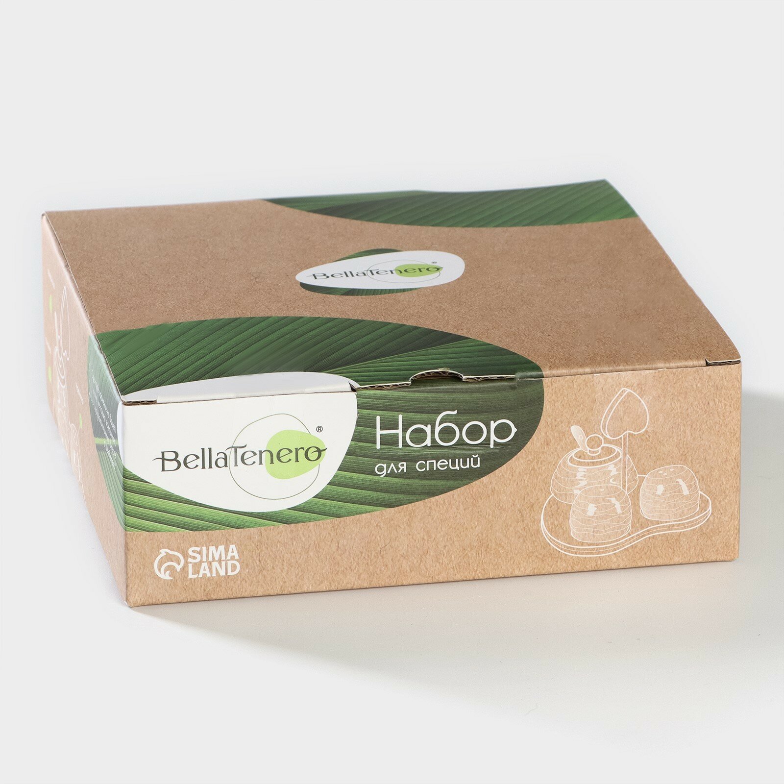 Купить Набор фарфоровый для специй на бамбуковой подставке, 5 предметов: солонка 80 мл, перечница 80 мл, сахарница с ложкой 170 мл, подставка-держатель, цвет белый
