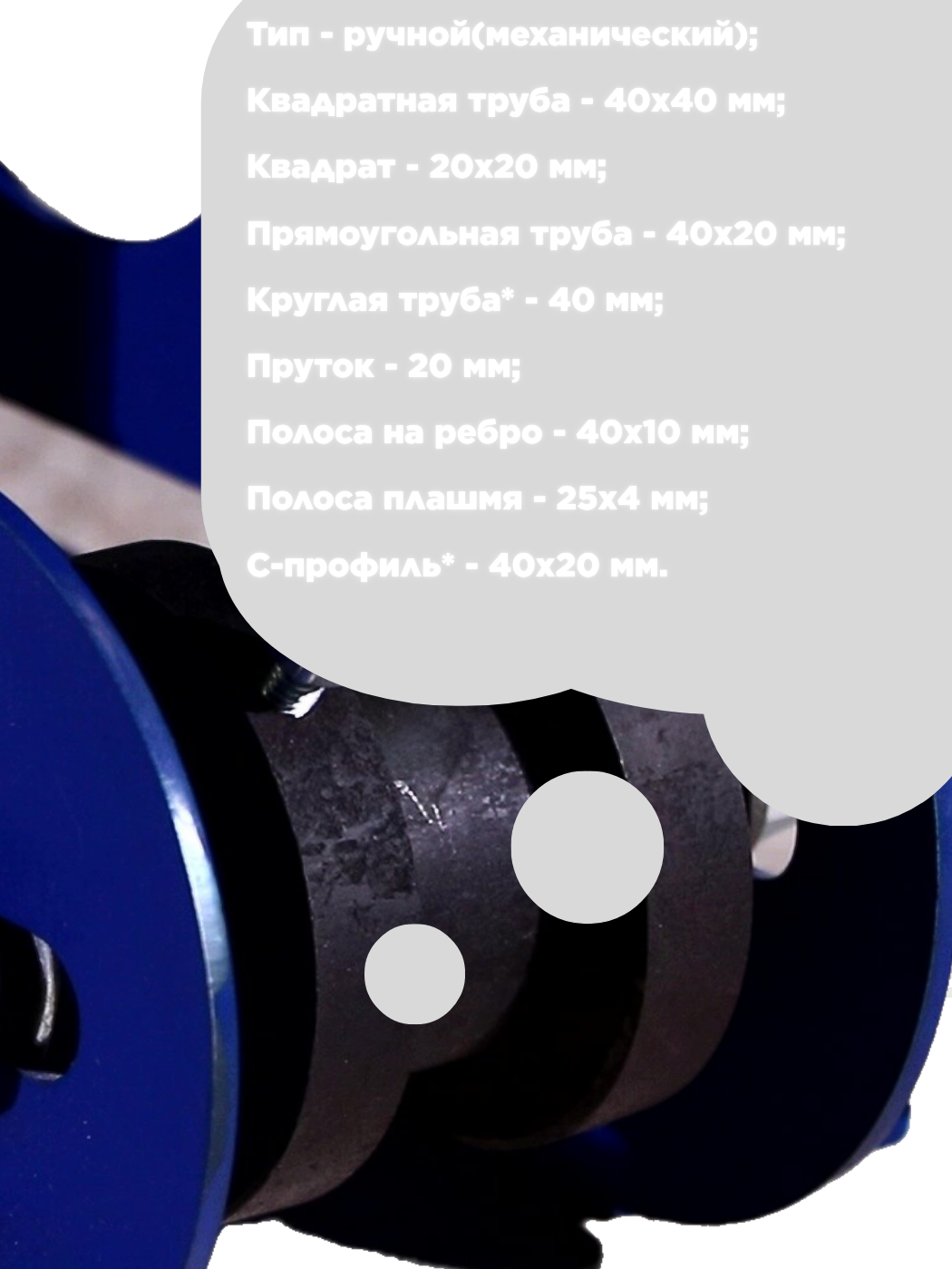 | Комплектация | Регулируемый комплект вальцов для прямоугольных труб – от 10х10 мм до 40х40 мм. |