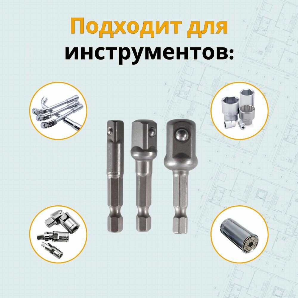 Переходники для шуруповерта под торцевые головки 1/4", 3/8", 1/2", комплект 3 шт интересное: