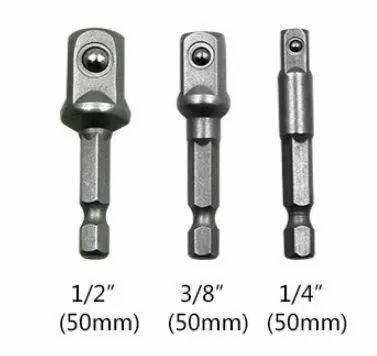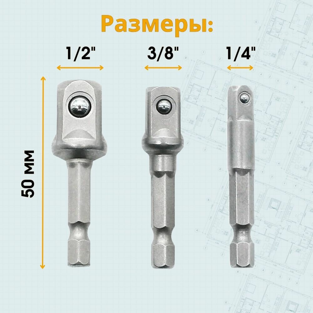 Купить Переходники для шуруповерта под торцевые головки 1/4", 3/8", 1/2", комплект 3 шт