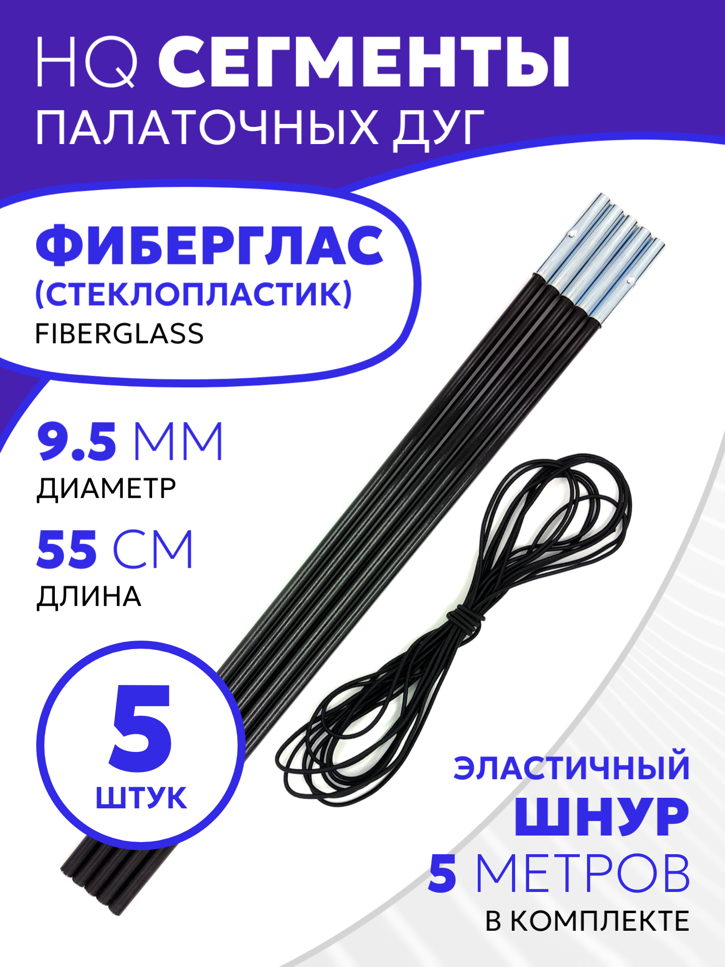 Купить Сегменты дуг для палатки (Ø 9,5 мм, длина 55 см, фиберглас, 5 штук) + эластичный шнур (5 метров)