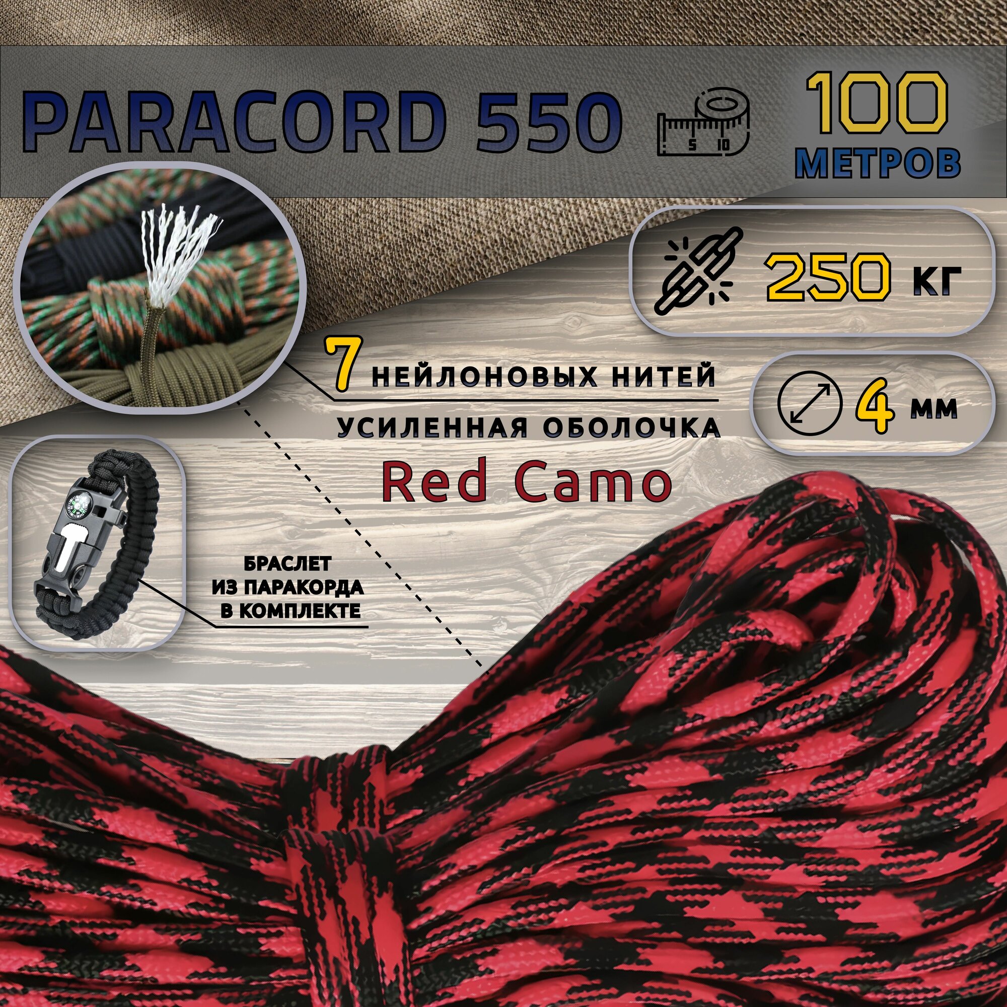 Купить Паракорд Paracord 550 Red Camo 100 м + браслет, 4 мм, нейлоновый сердечник 7 нитей, туристический трос/веревка, 100 метров