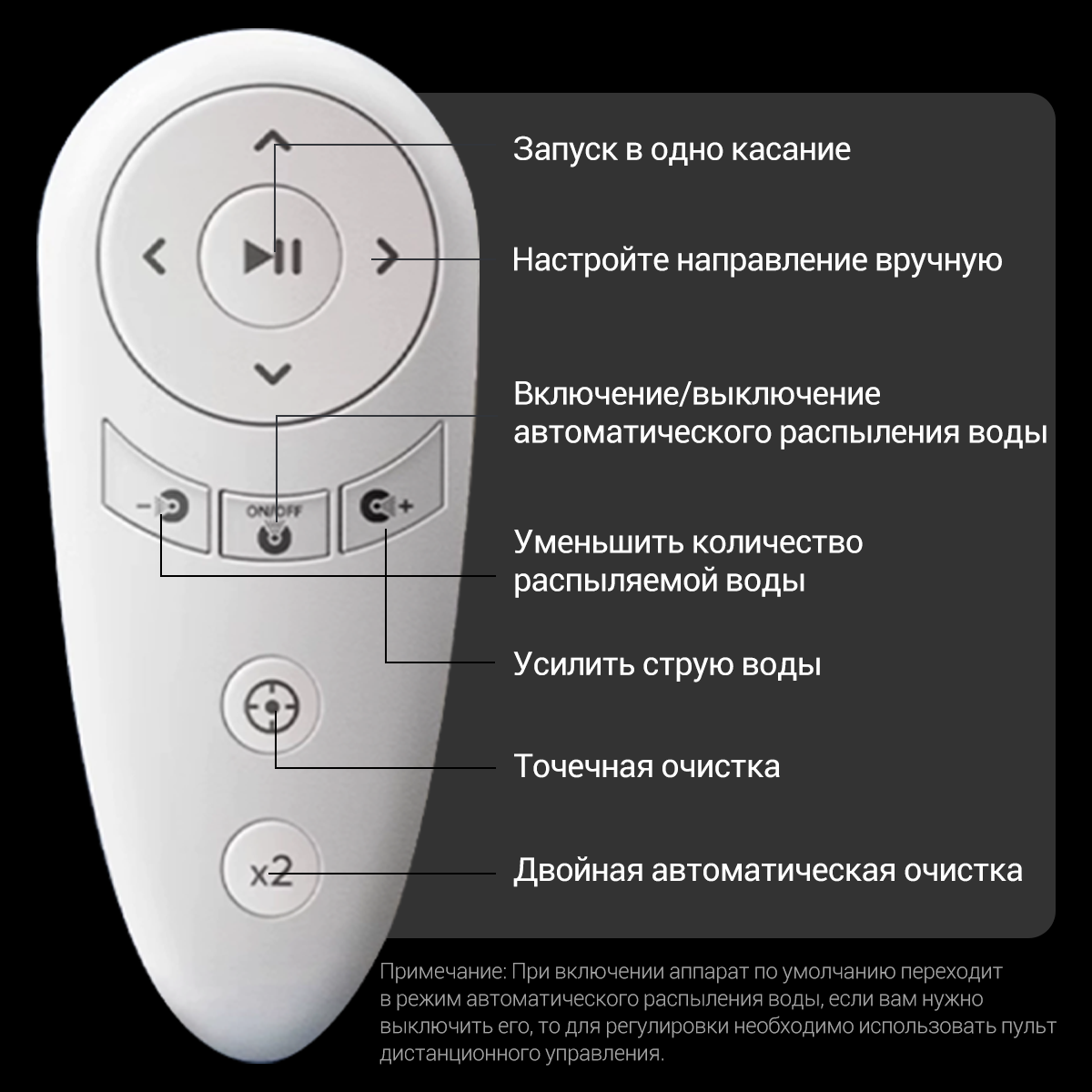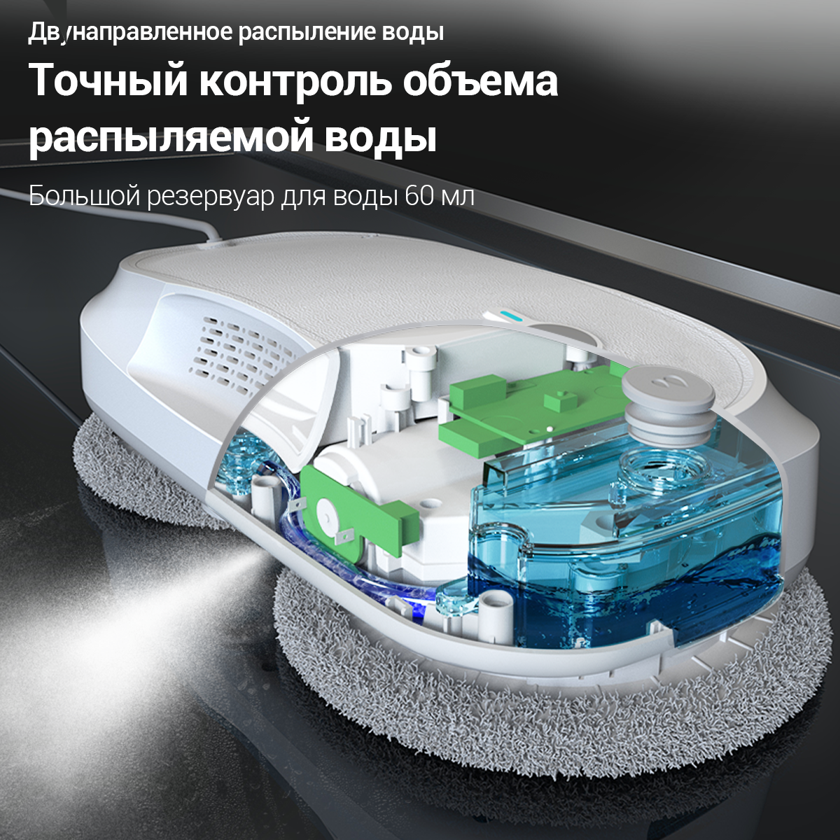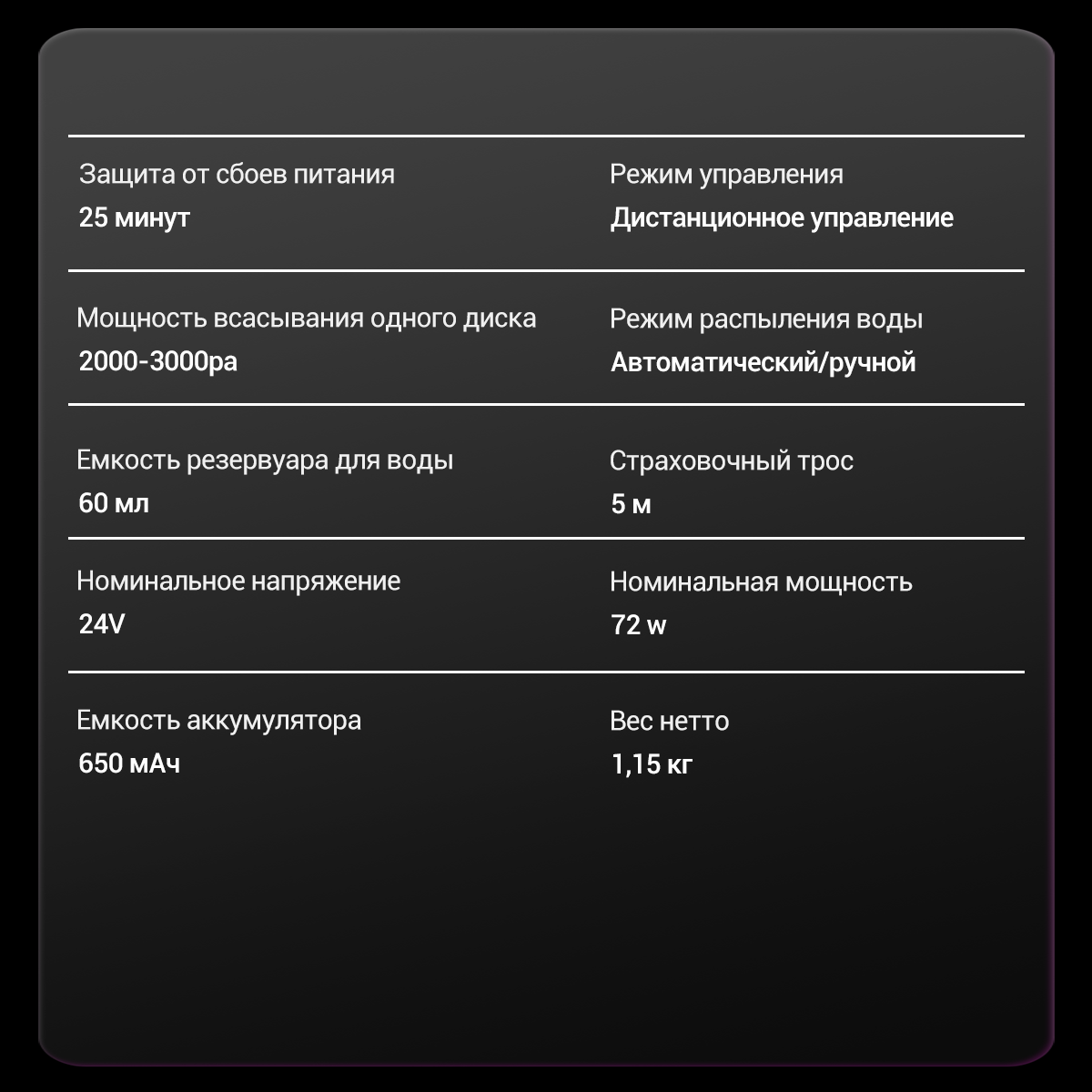 | Дополнительная информация | Двунаправленное распыление воды,Сила всасывания 3000pa,8 чистящих салфеток,Точечная очистка,Двойная автоматическая очистка ,Большой резервуар для воды 60 мл |