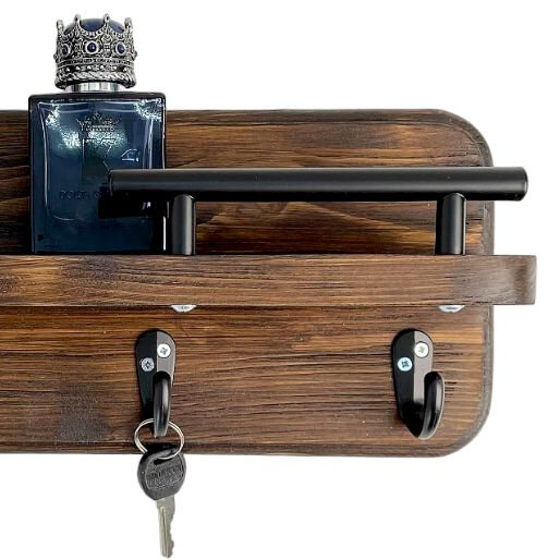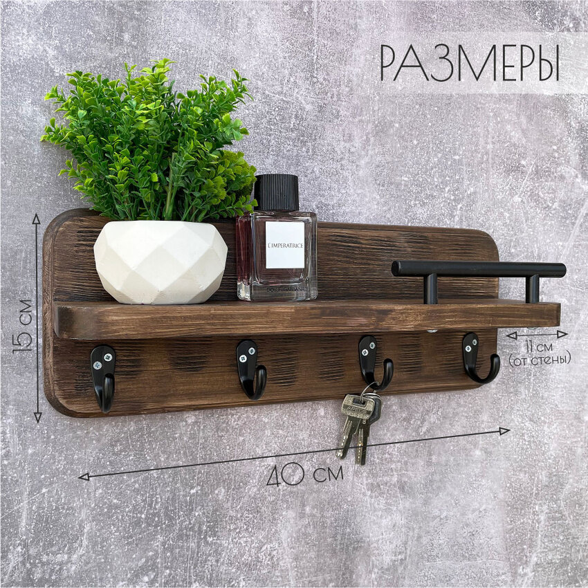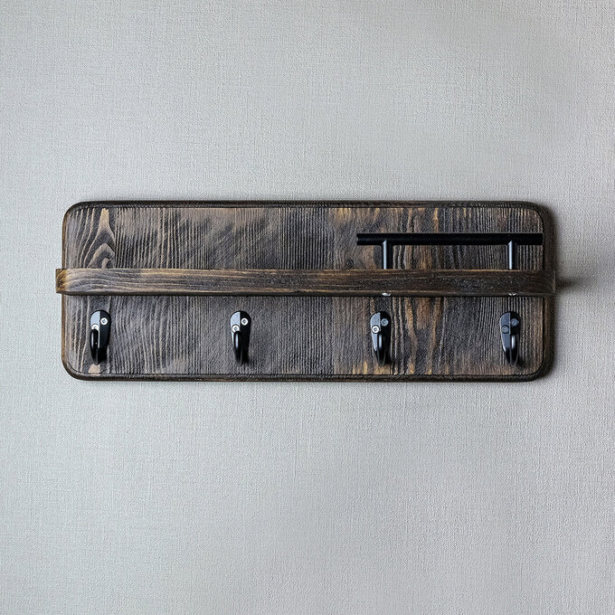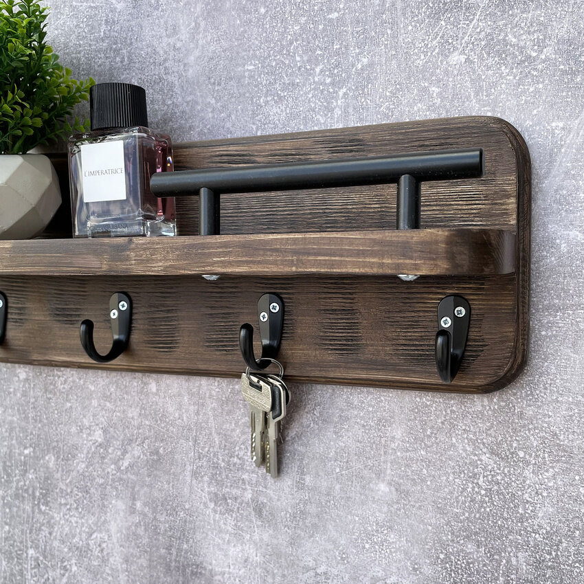 Полка настенная с крючками черная Ключница на стену деревянная Вешалка для ключей