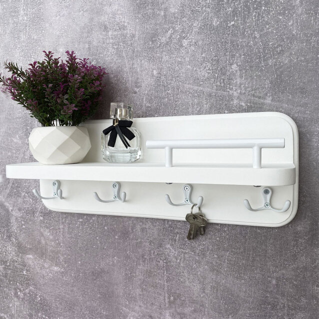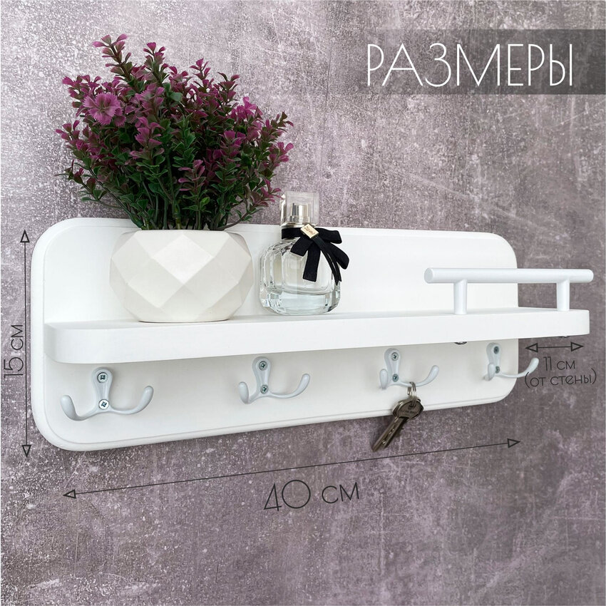 Полка настенная с крючками белая Ключница на стену деревянная Вешалка для ключей