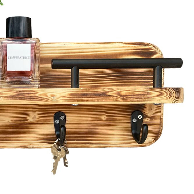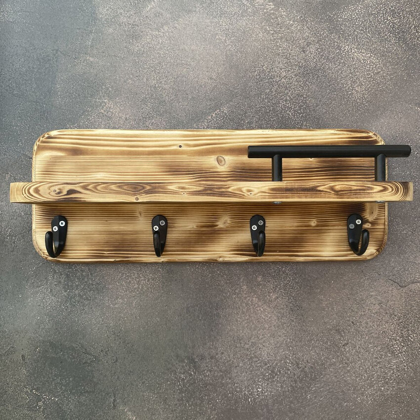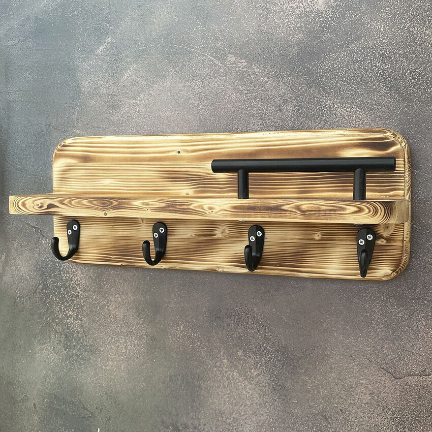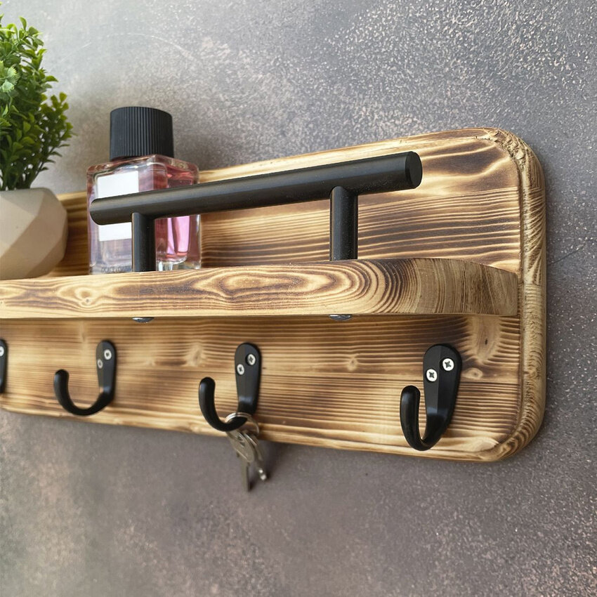 Полка настенная с крючками черная Ключница на стену деревянная Вешалка для ключей