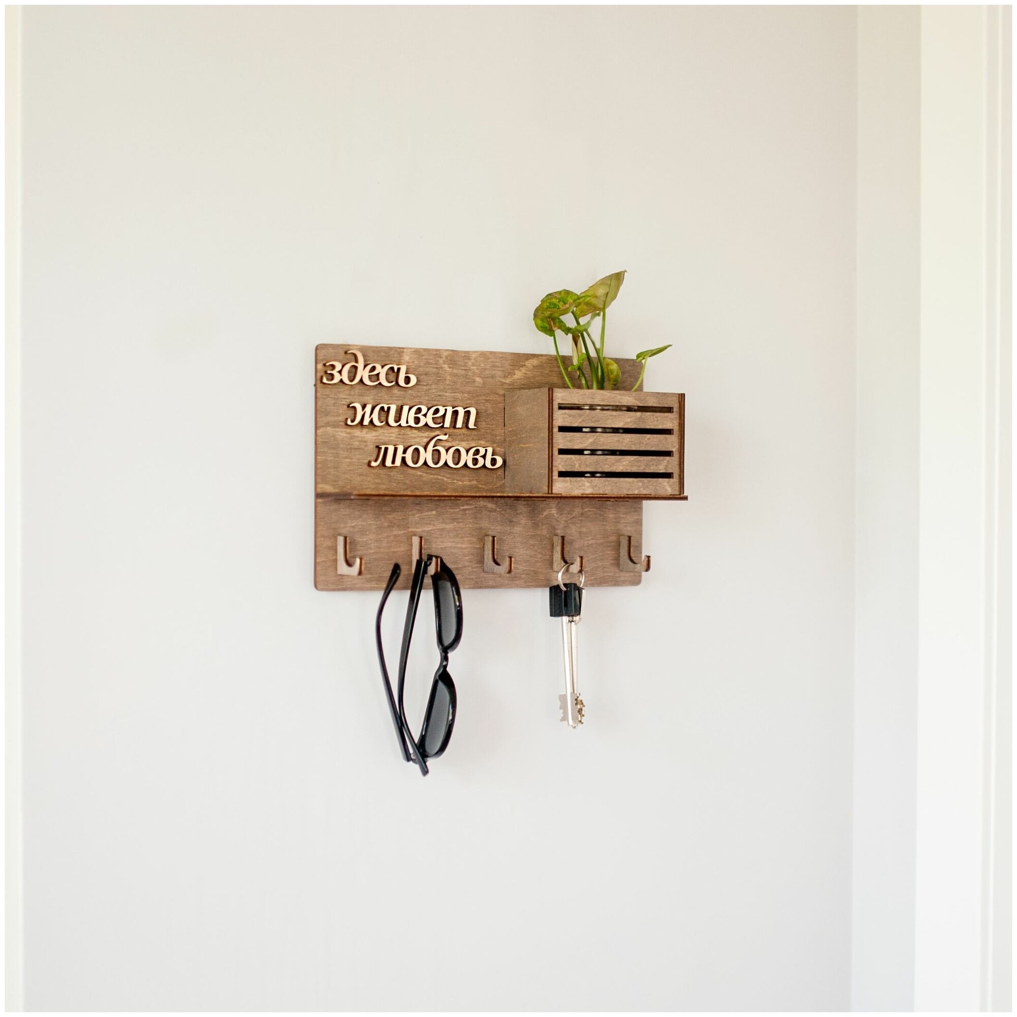 Ключница настенная Bezusoff "Здесь живет любовь", дерево, коричневая 25x16 см, 5 крючков