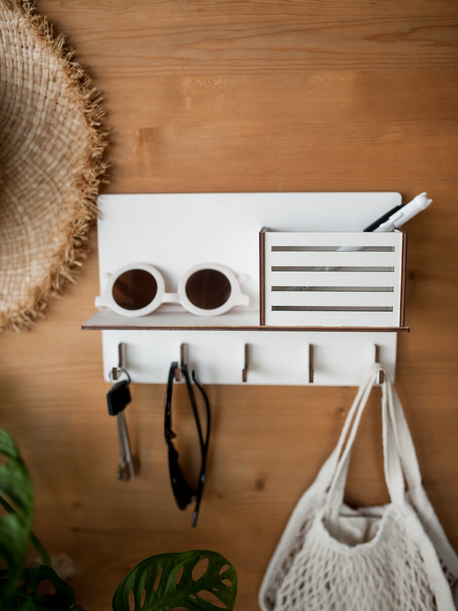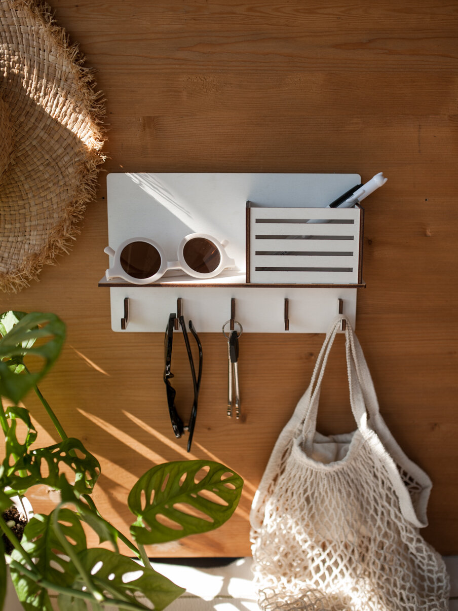 Купить Ключница настенная деревянная Bezusoff с 5 крючками и полочкой. Цвет белый, размер 25 см на 16 см.