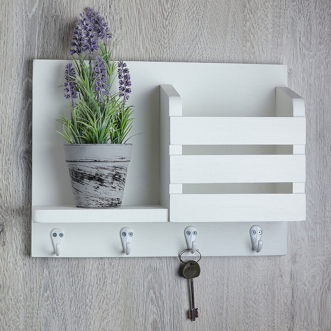 Настенная белая ключница с полками и карманом для ключей, из натурального дерева