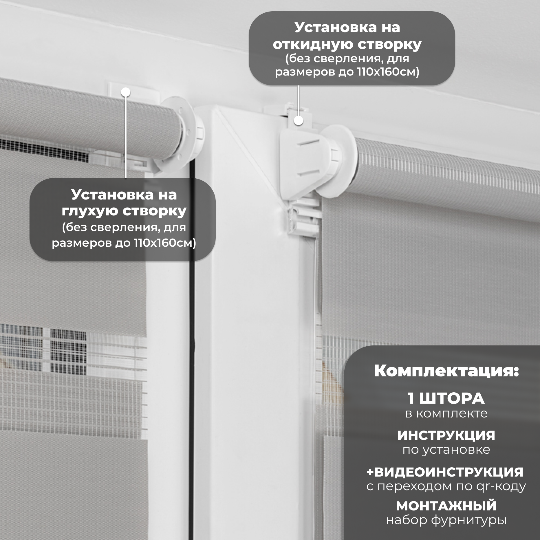 | Дополнительная информация | Несколько вариантов установки: без сверления на пластиковое глухое окно или с поворотно-откидным механизмом; со сверлением - на любое окно, на неподвижную раму, на стену (оконный проем), на раму, к потолку, в проем. |