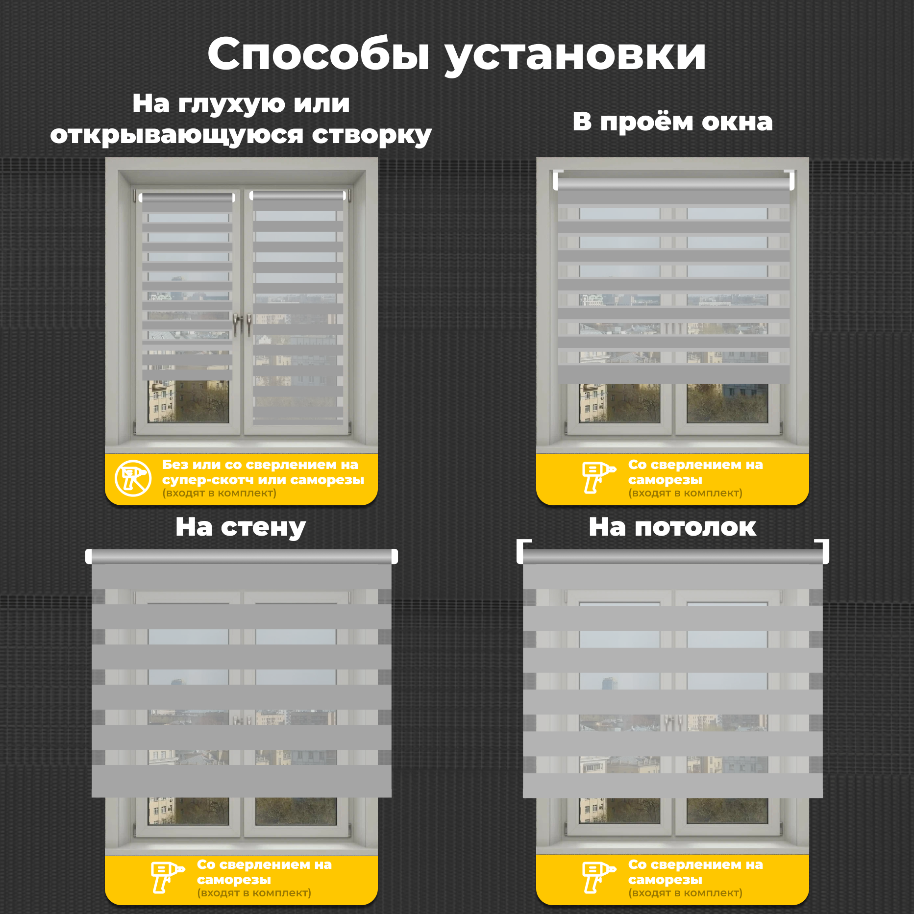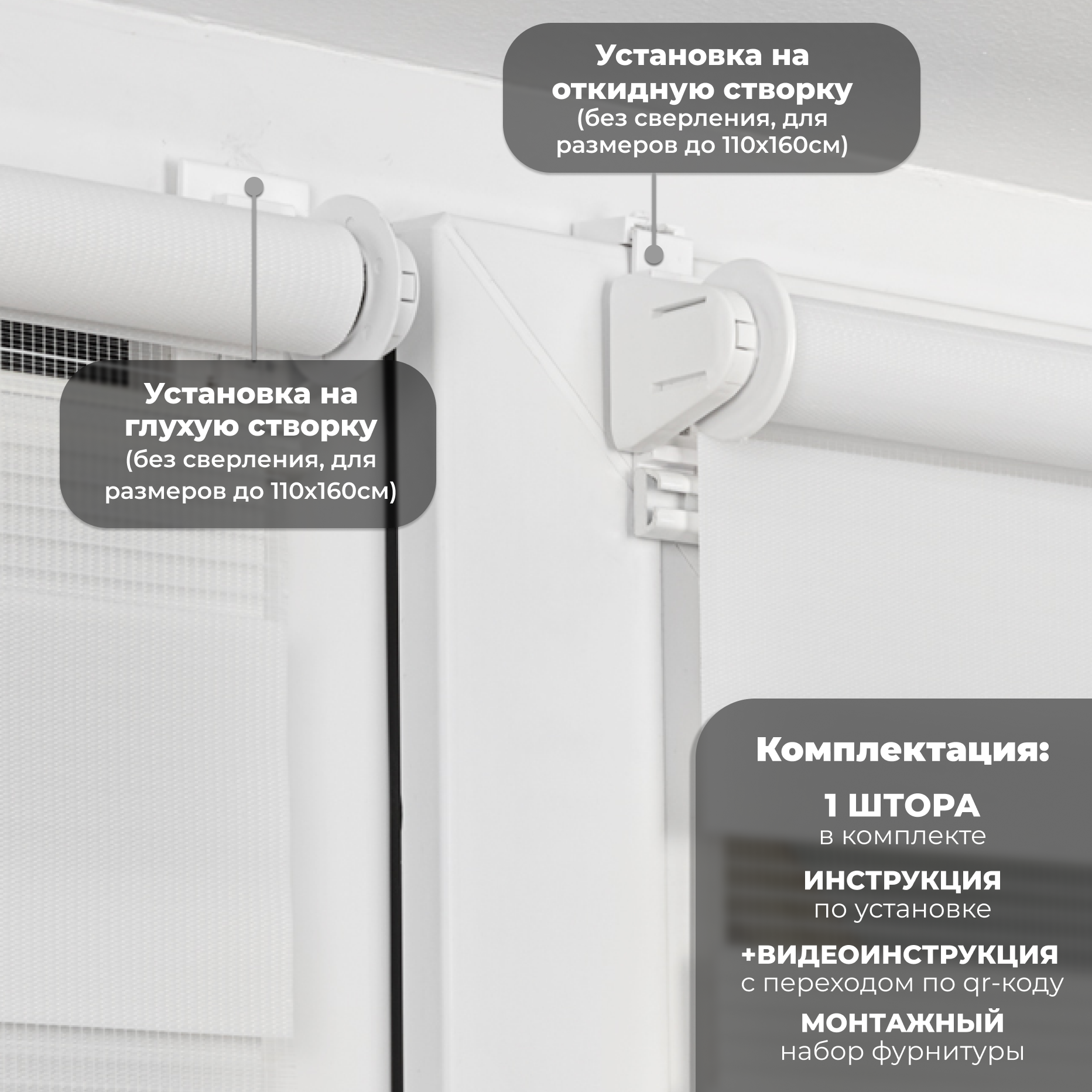 | Дополнительная информация | Несколько вариантов установки: без сверления на пластиковое глухое окно или с поворотно-откидным механизмом; со сверлением - на любое окно, на неподвижную раму, на стену (оконный проем), на раму, к потолку, в проем. |