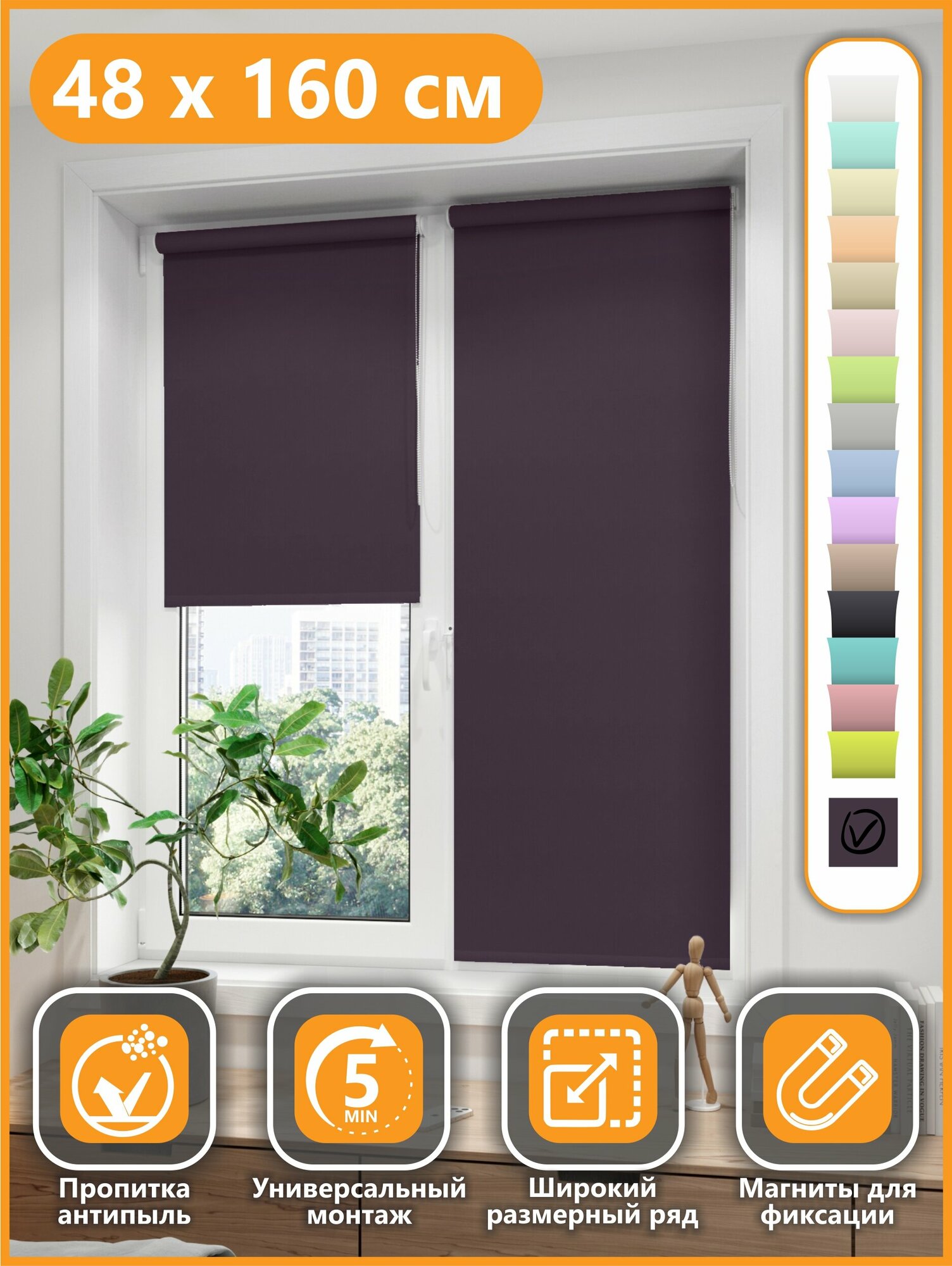 Сохранить48*160 Универсальная рулонная штора с/з 80%, Однотонный Темно-Фиолетовый интересное: