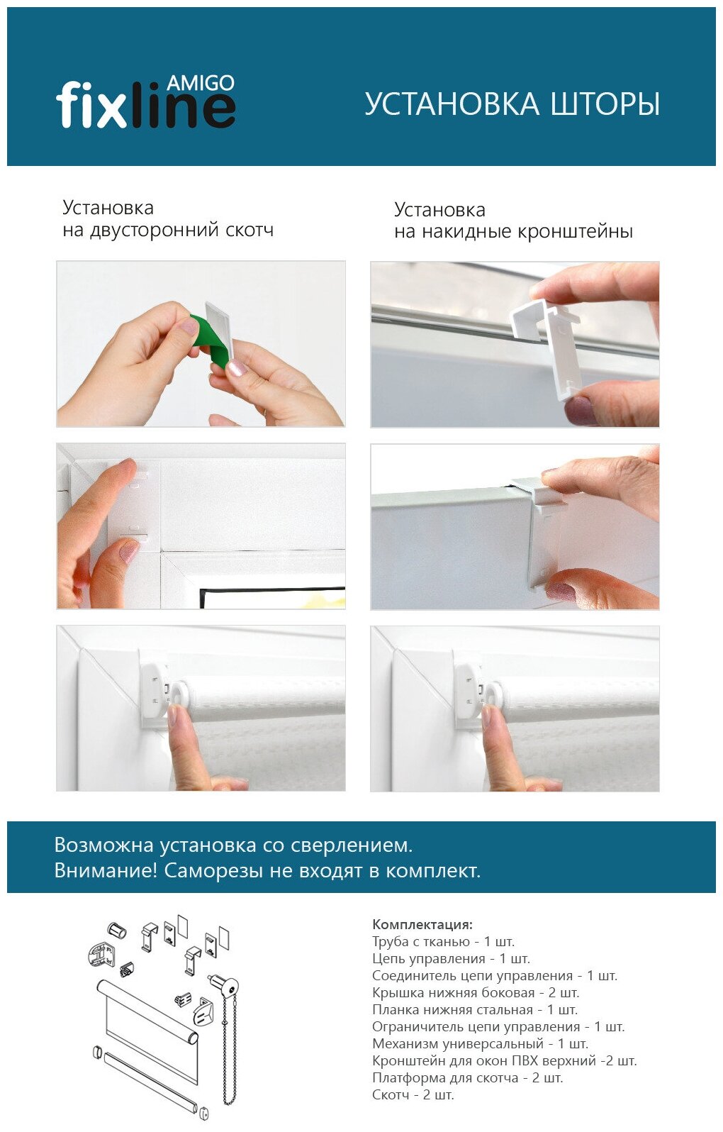 | Комплектация | Труба с тканью - 1 шт. Цепь управления - 1 шт. Соединитель цепи управления - 1 шт. Крышка нижняя боковая - 2 шт. Планка нижняя стальная - 1 шт. Ограничитель цепи управления - 1 шт. Механизм универсальный - 1 шт. Кронштейн для окон ПВХ верхний -2 шт. Платформа для скотча - 2 шт. Скотч - 2 шт. |