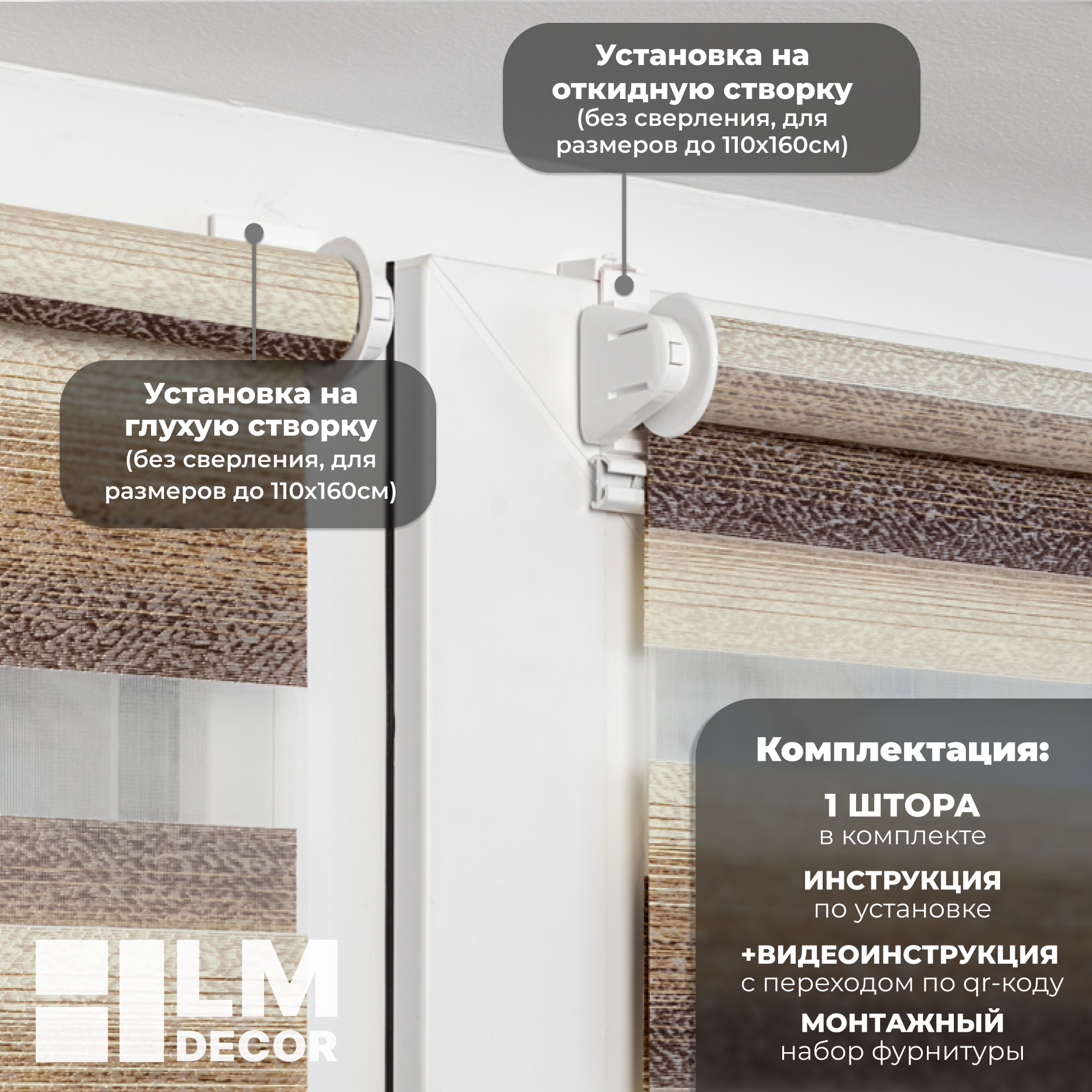| Дополнительная информация | Несколько вариантов установки: без сверления на пластиковое глухое окно или с поворотно-откидным механизмом; со сверлением - на любое окно, на неподвижную раму, на стену (оконный проем), на раму, к потолку, в проем. |