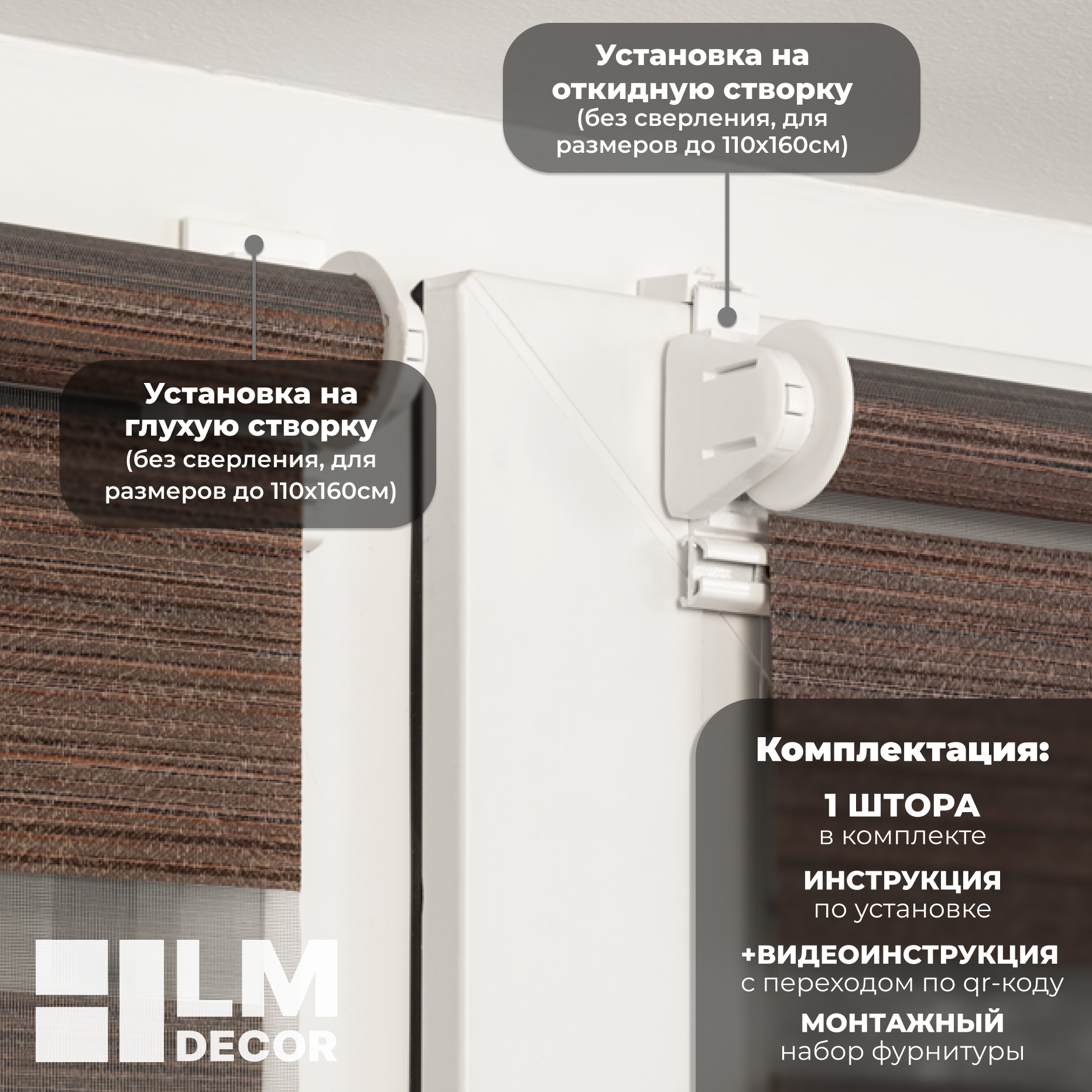| Дополнительная информация | Несколько вариантов установки: без сверления на пластиковое глухое окно или с поворотно-откидным механизмом; со сверлением - на любое окно, на неподвижную раму, на стену (оконный проем), на раму, к потолку, в проем. |