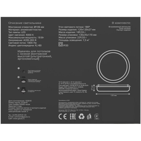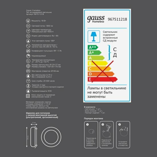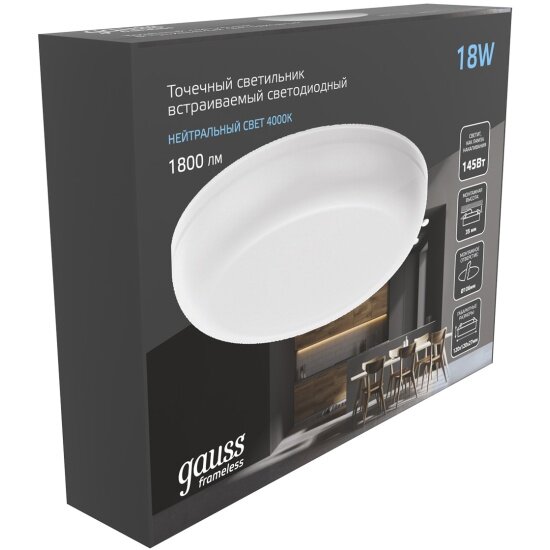 Встраиваемый светильник Gauss Frameless круг 18W, 4000K, 1/40 интересное: