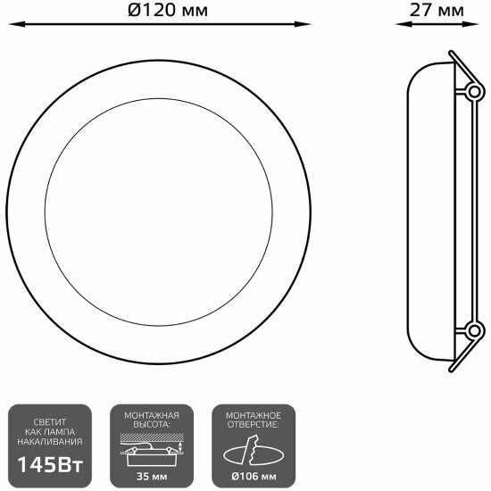 | Ширина/диаметр врезного отверстия | 106 мм |