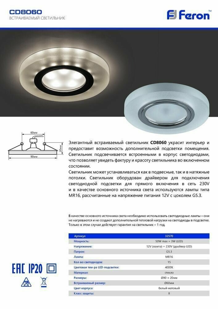 Ниже Вы можете прочитать отзывы на Светильник потолочный светодиодный, встраиваемый с белой LED подсветкой FERON CD8060, 50Вт, 4000К, MR16, G5.3 белый матовый, 2 шт, ознакомится с подробными характеристиками, посмотреть интересные обзоры и фотографии на Светильник потолочный светодиодный, встраиваемый с белой LED подсветкой FERON CD8060, 50Вт, 4000К, MR16, G5.3 белый матовый, 2 шт.