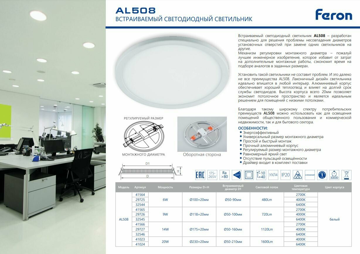 Feron AL508 Светодиодный светильник 14W, 4000K,1120Lm, белый 29727 .