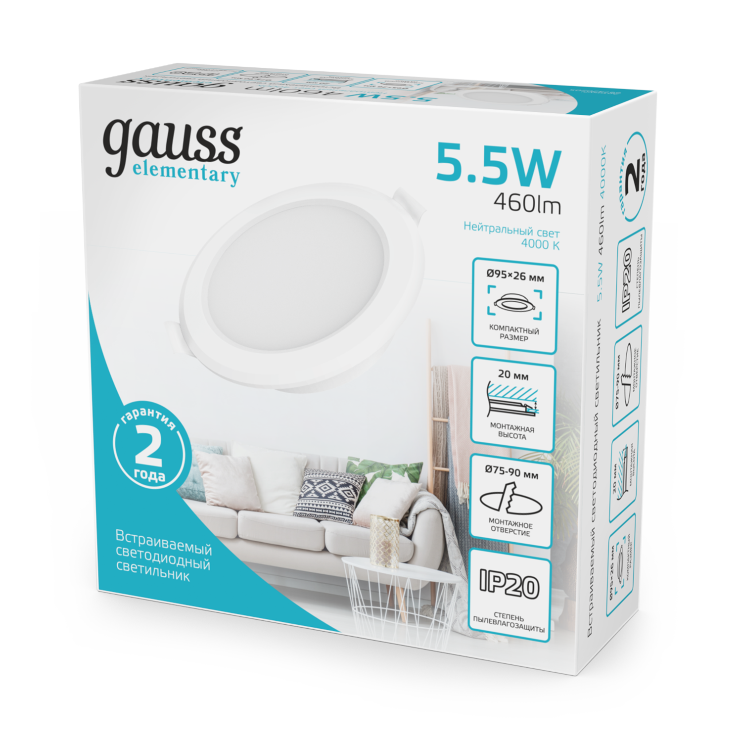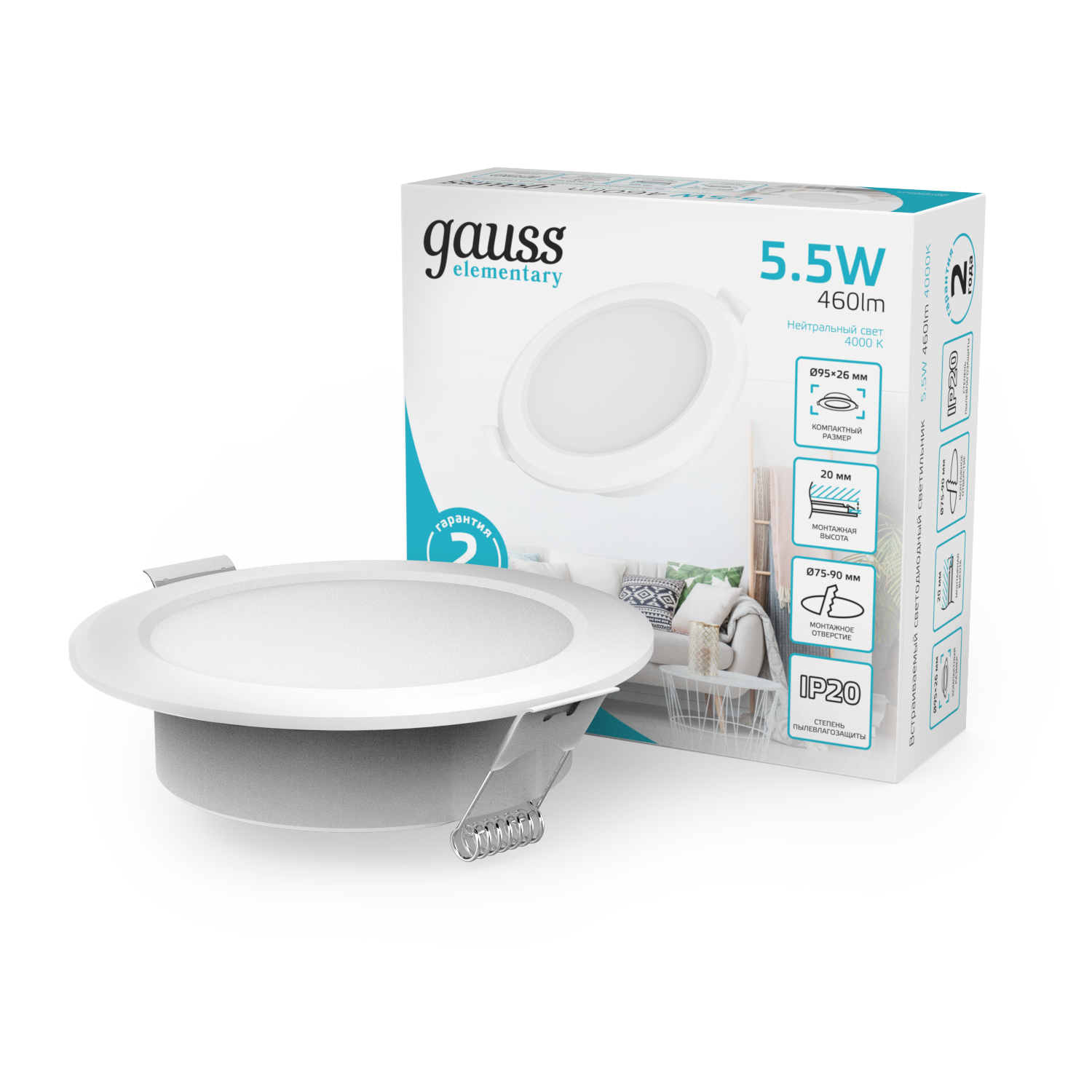 Светильник Gauss Elementary Downlight круг 5W 430lm 4000K 210-240V IP20 95*38 монтаж бел.LED (3шт. в упак.) LED 1/40