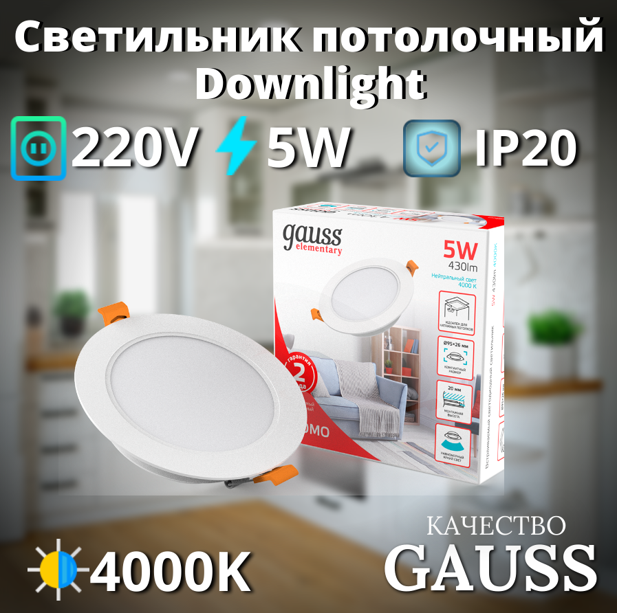 Светильник Gauss Elementary Downlight круг 5W 430lm 4000K 210-240V IP20 95*38 монтаж бел.LED (3шт. в упак.) LED 1/40
