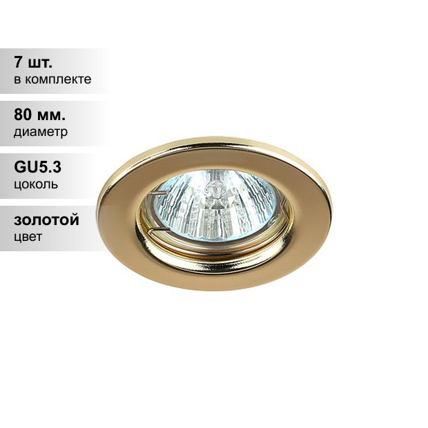 Сохранить(7 шт.) Светильник встраиваемый точечный ЭРА ST1 GD, цоколь GU5.3, тип лампы MR16, напряжение 12 В, максимальная мощность лампы 50 Вт, ширина 80 мм, диаметр отверстия 60 мм, штампованная сталь, золото интересное: