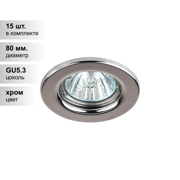 Сохранить(15 шт.) Светильник встраиваемый точечный ЭРА ST1 CH, цоколь GU5.3, тип лампы MR16, напряжение 12 В, максимальная мощность лампы 50 Вт, ширина 80 мм, диаметр отверстия 60 мм, штампованная сталь, хром интересное: