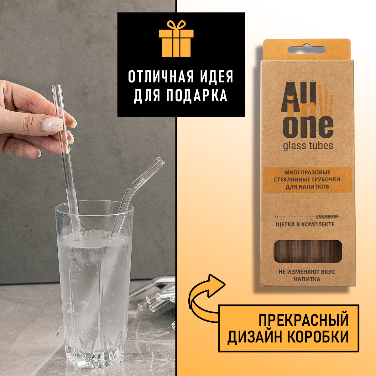 Многоразовые стеклянные эко-трубочки All in One для коктейлей, напитков с ёршиком, прямые/изогнутые, прозрачные, 4+1 интересное: