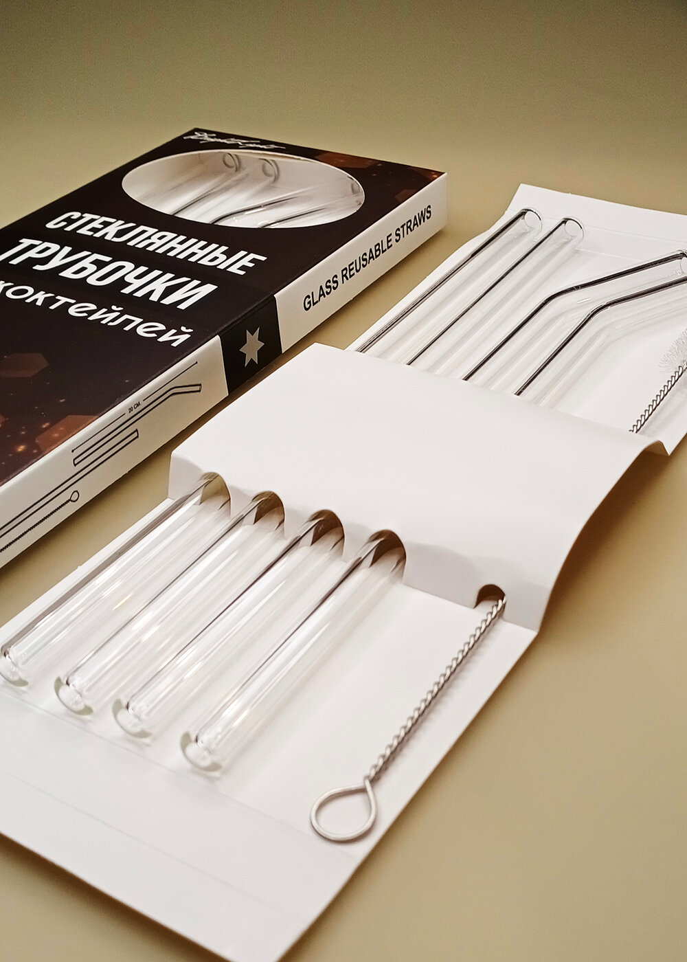 Трубочки коктейльные стеклянные, прозрачные, многоразовые в пластиковом кейсе. 3 шт. + 1 ёршик. 20см х 0,8см.