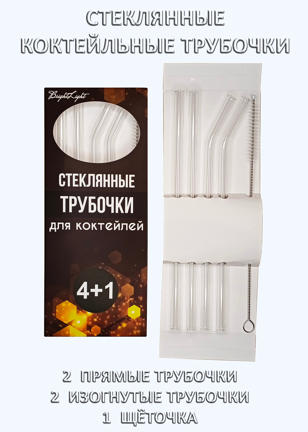 Стеклянные трубочки для коктейлей и напитков фигурной формы прозрачные многоразовые 20 х 0,8 см. 4 шт + 1 ёршик