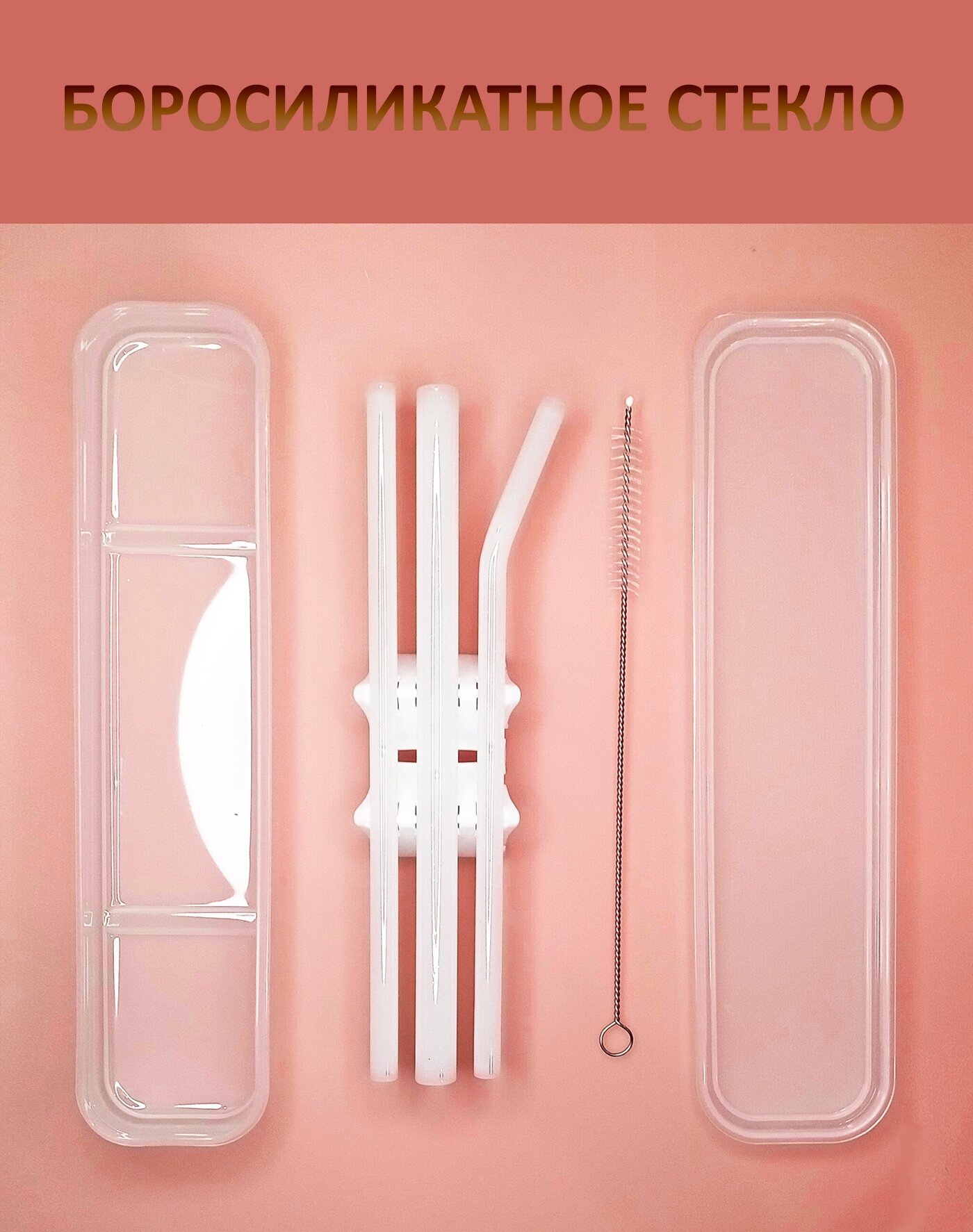 Купить Трубочки коктейльные стеклянные, белые, многоразовые в пластиковом кейсе. 3 шт. + 1 ёршик. 20см х 0,8см.