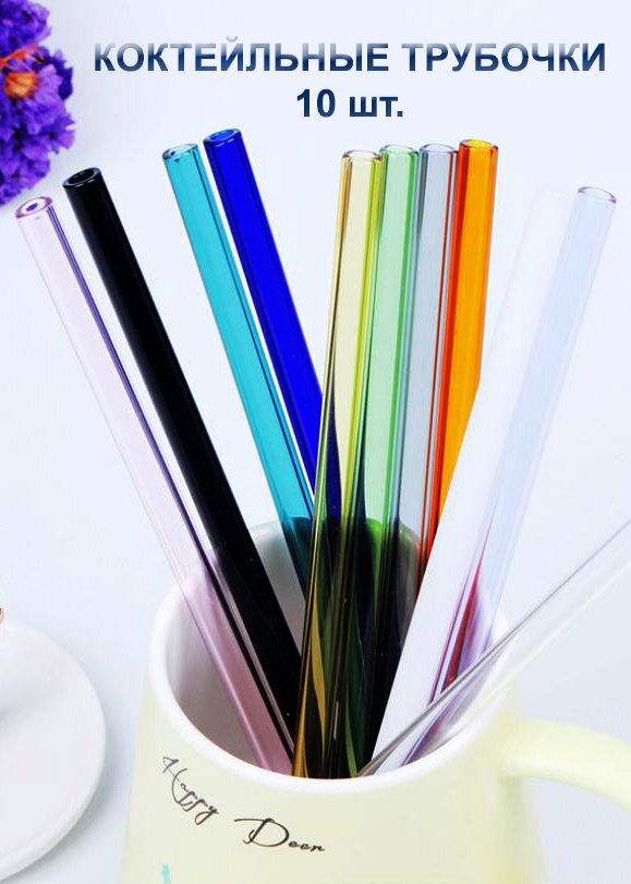 Купить Трубочки стеклянные для коктейлей, многоразовые, разноцветные. 20 х 0,8 см. 10 шт. + ёршик. Соломинки для напитков.