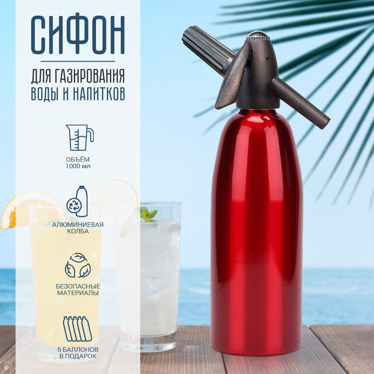 Сифон для газирования воды и напитков, 1л, красный