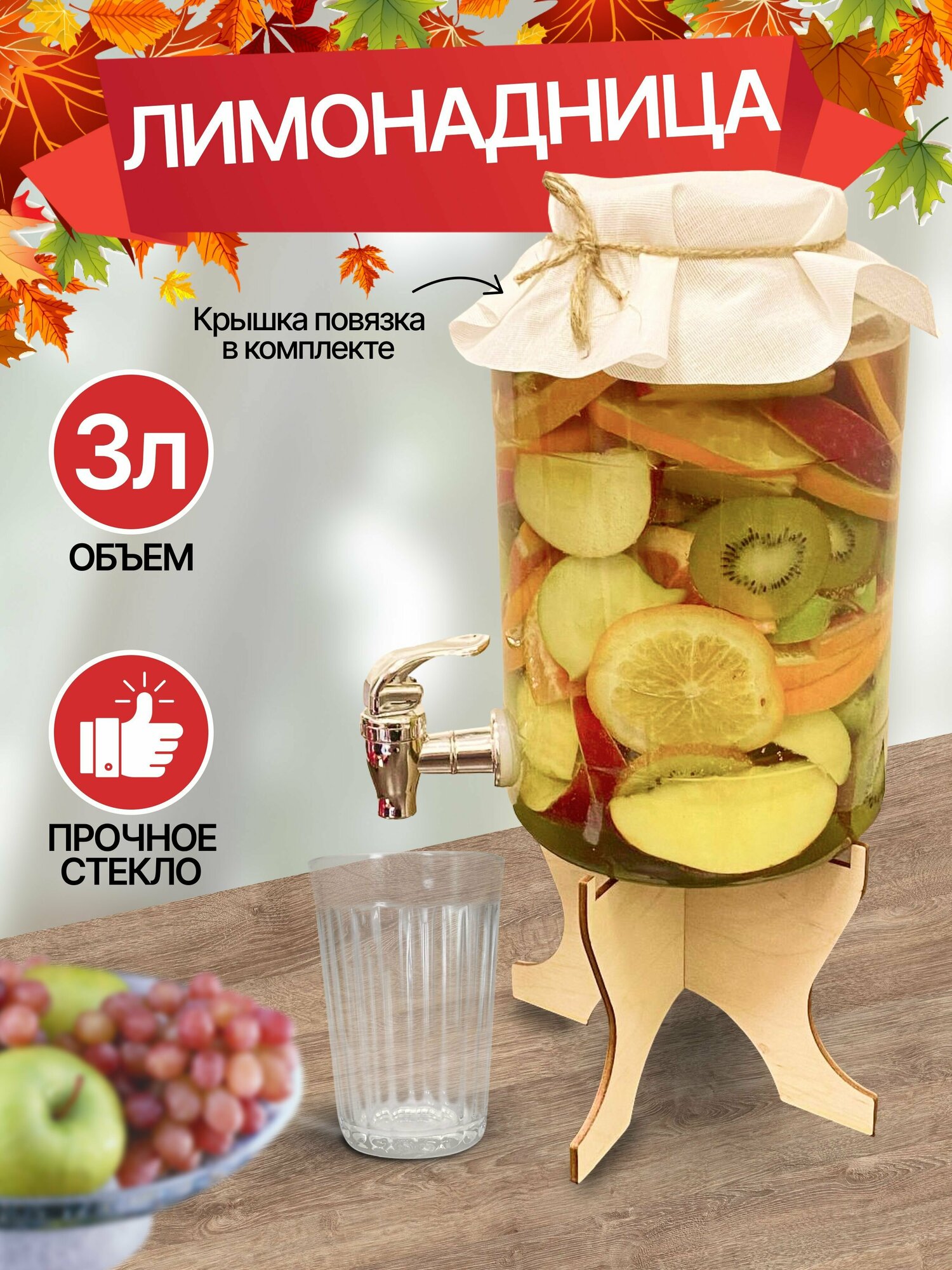 | Подробная комплектация | Лимонадник 3 л стеклянный с краником + подставка . Крышка в комплекте НЕ поставляется. Кран в комплекте вкручен не до конца. В случаи протекания подтяните гайку внутри банки. |